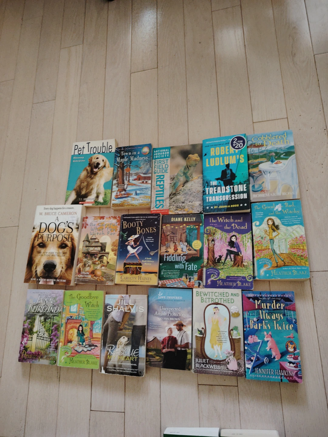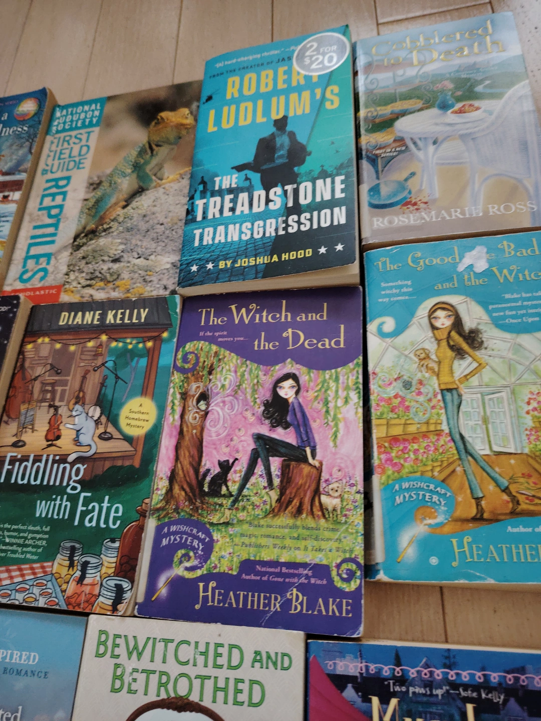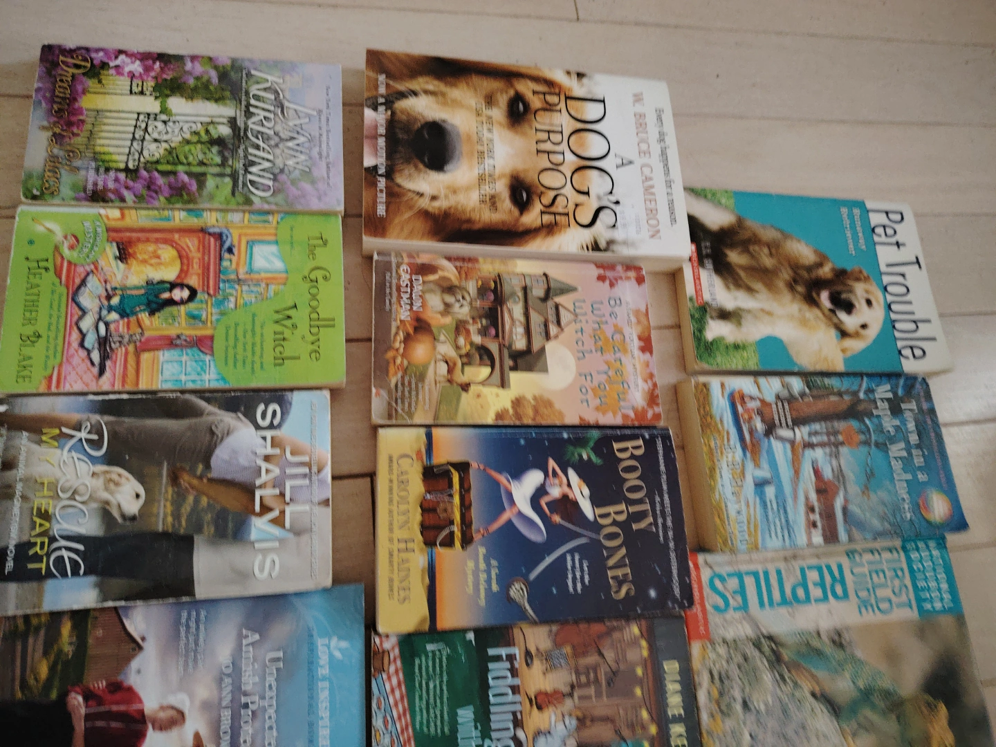 893Assortment of paperback novels and non-fiction books. Various genres including fiction, mystery, and romance. Great for readers or collectors. Titles include A Dog's Purpose, Pet Trouble.