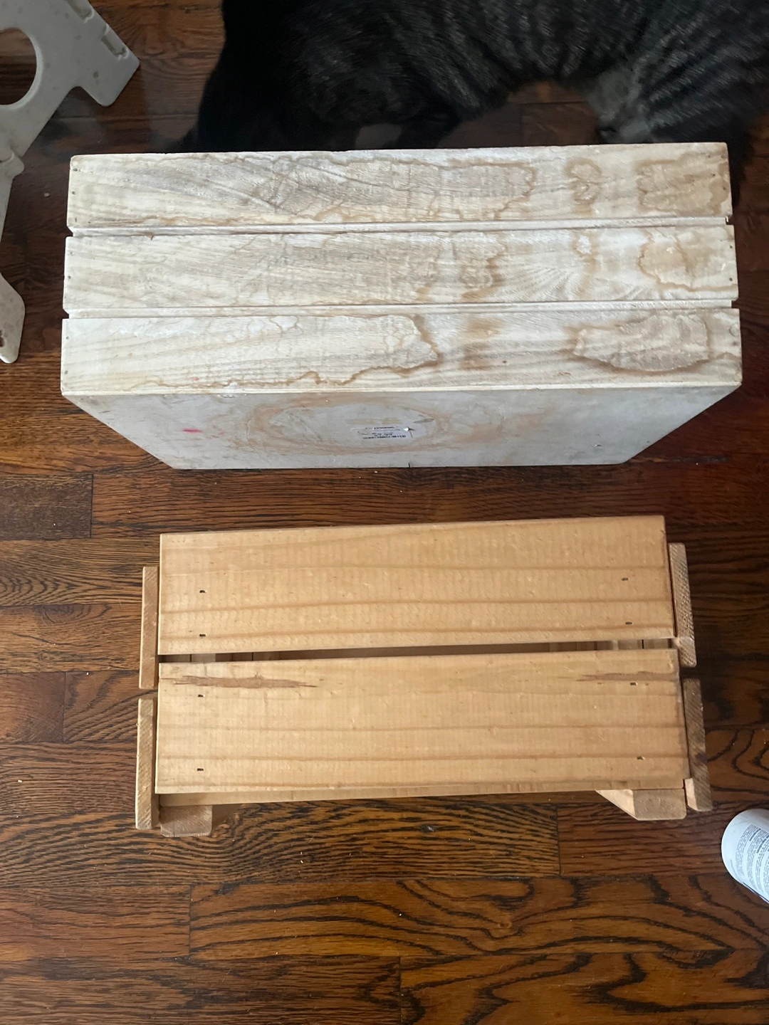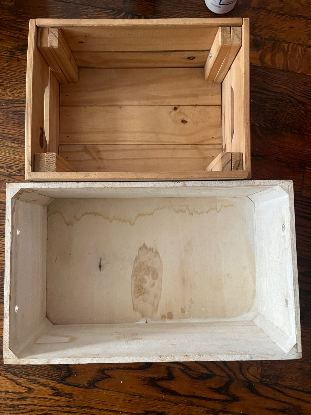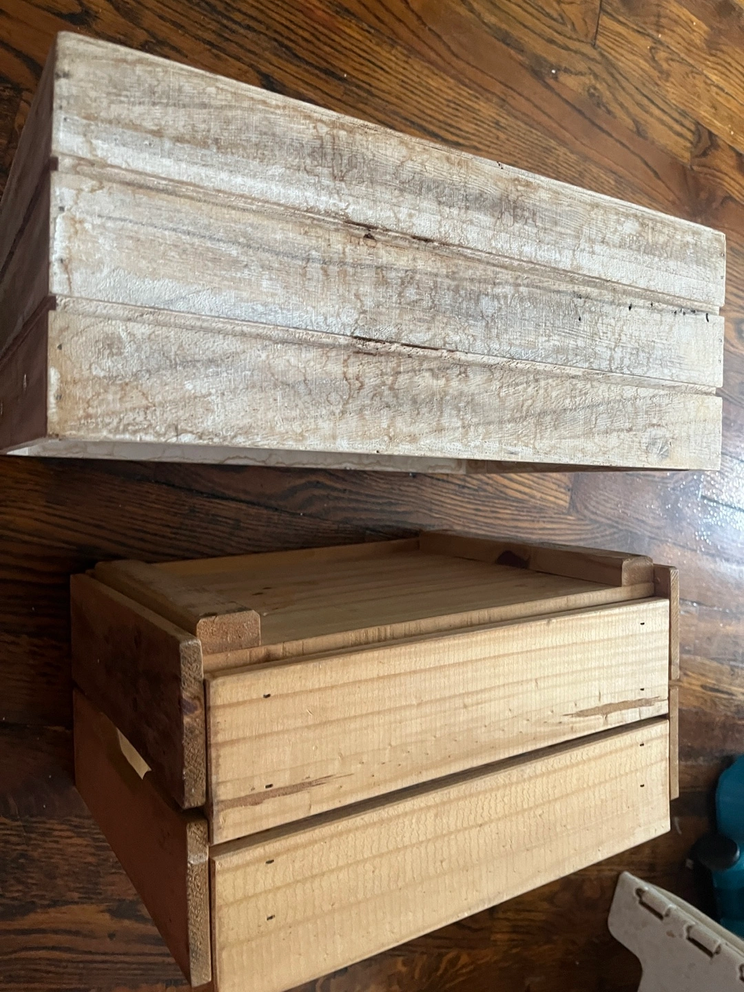 Set of two wooden crates. One natural wood, one whitewashed. Great for storage or decoration. Varying sizes. Show some wear.