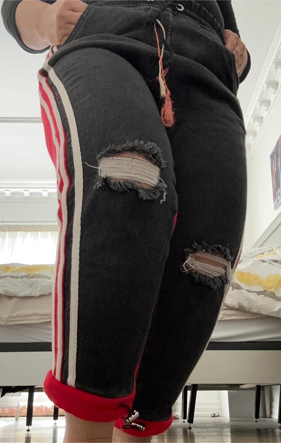 Buy & SellDistressed Black and Red Jeans with Side StripesDistressed Black and Red Jeans with Side Stripes$5Women's black denim jeans. Features red and white side stripes. Distressed detailing at the knees. Drawstring waist. Red cuffs.ConditionLike newSize40&42WHERE TO MEET331 Connaught AveView MapSELLERverifiedMojiThornhill S770 reviews0 chats·0 favorites·8 views
