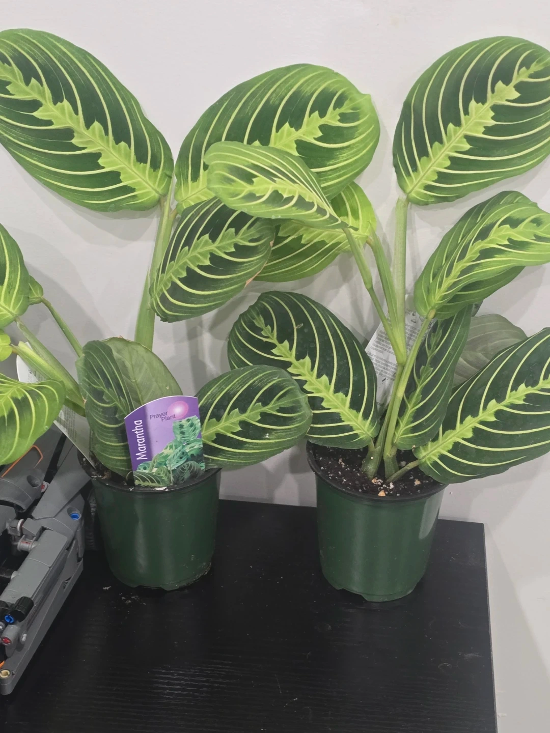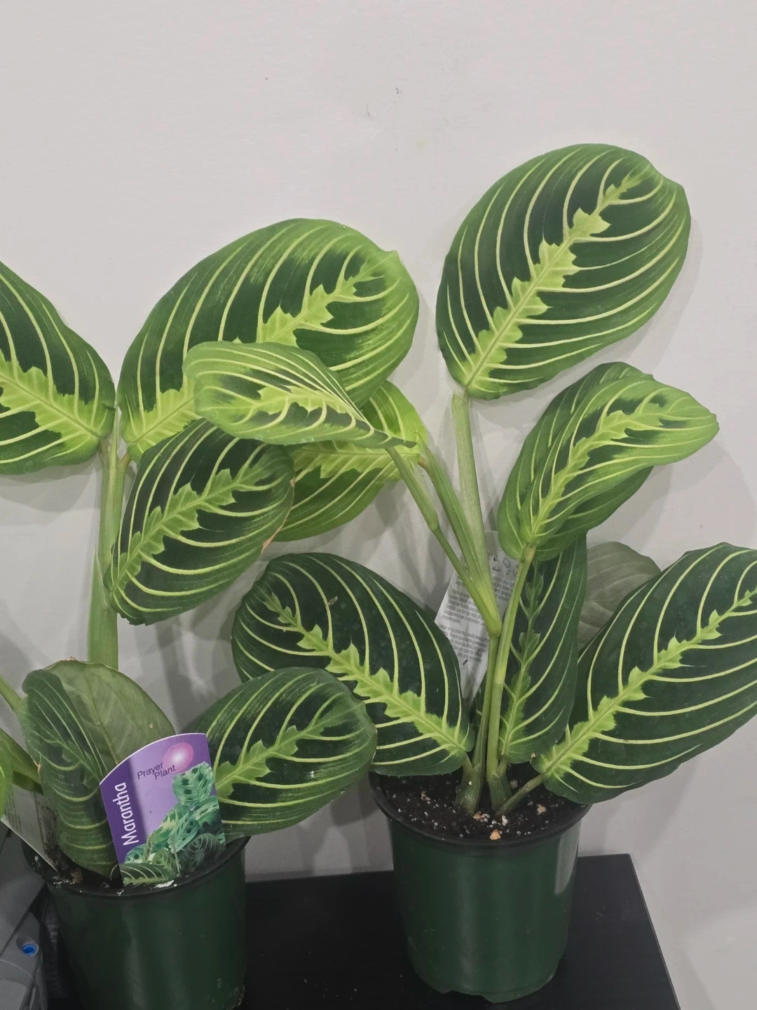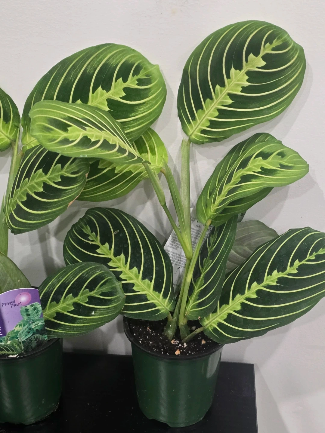 A healthy prayer plant with distinct green and white striped leaves. It's in a dark green pot with soil. The plant's leaves move throughout the day.