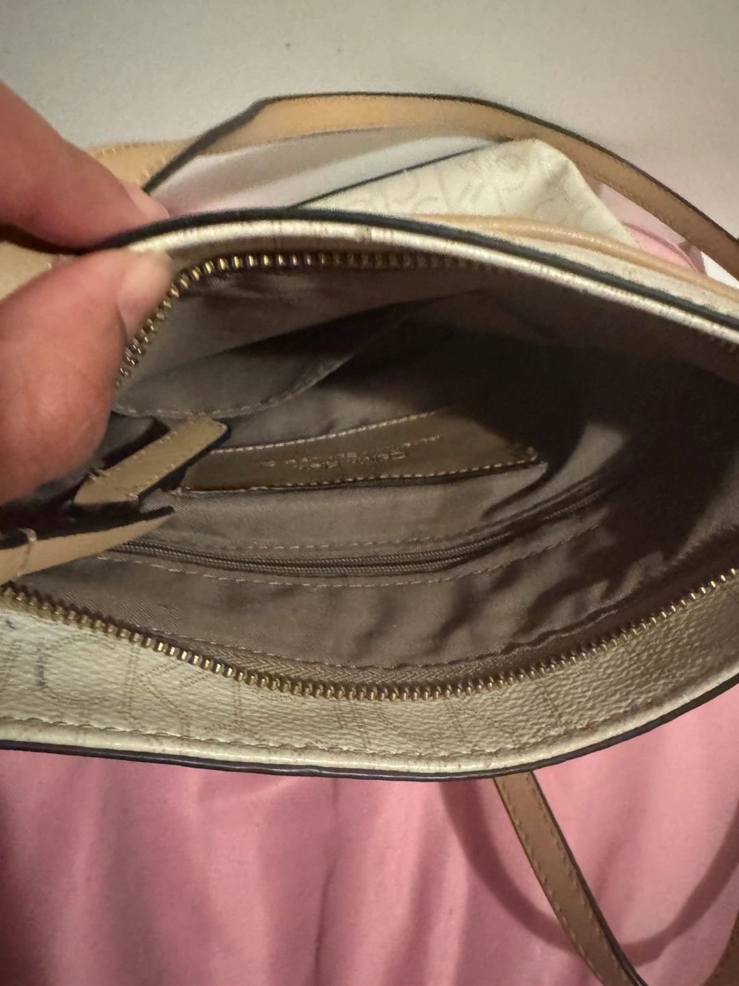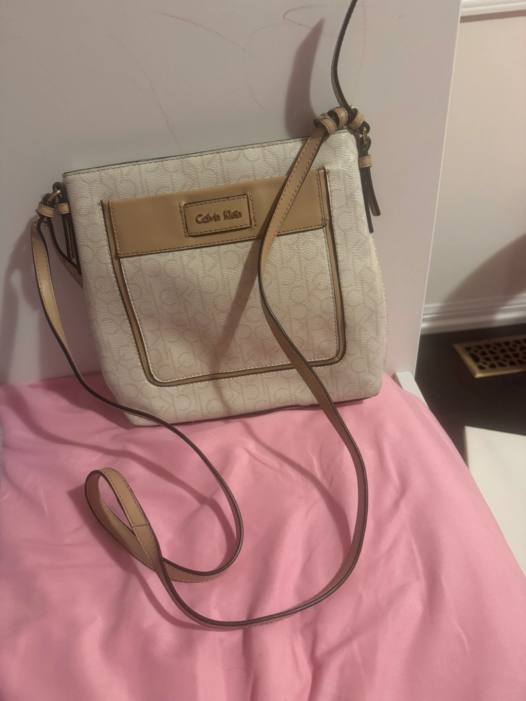 Cream-coloured crossbody bag. Features a beige adjustable strap and zip closure. Small interior pocket. Monogrammed Calvin Klein branding.