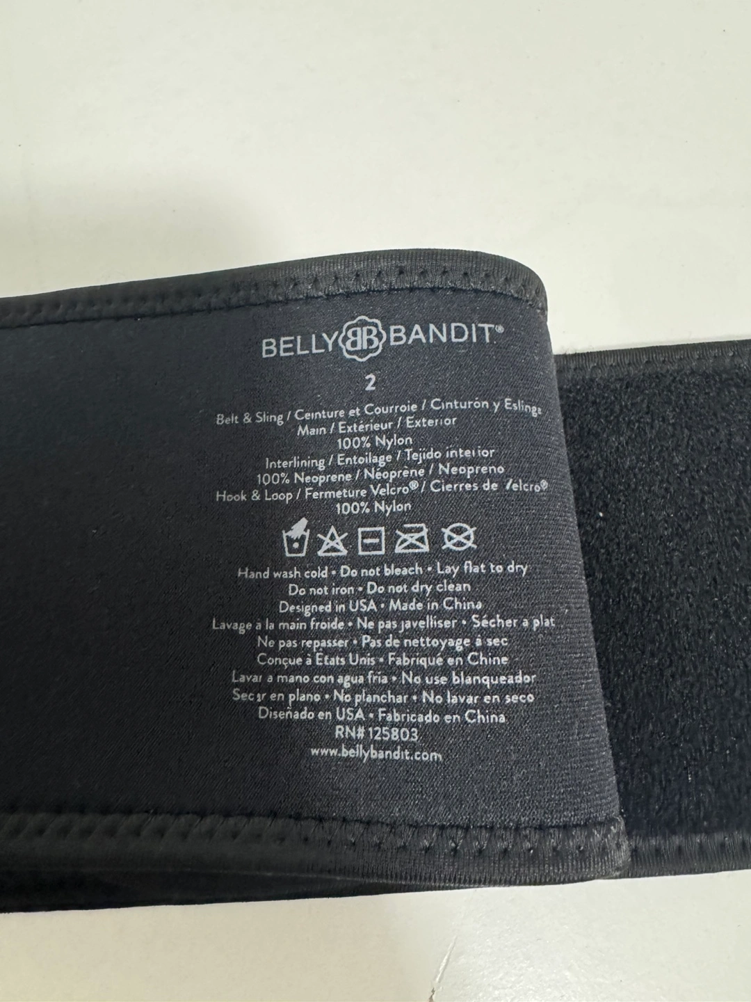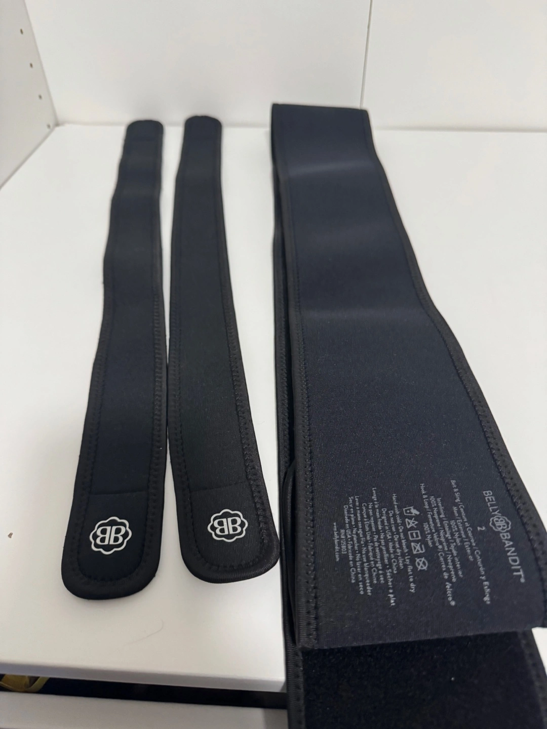 Belly Bandit postpartum recovery set. Includes two smaller straps and one longer belly band. Black neoprene material. Hand wash cold, do not bleach, lay flat to dry. Designed in the USA, fabricated in China.