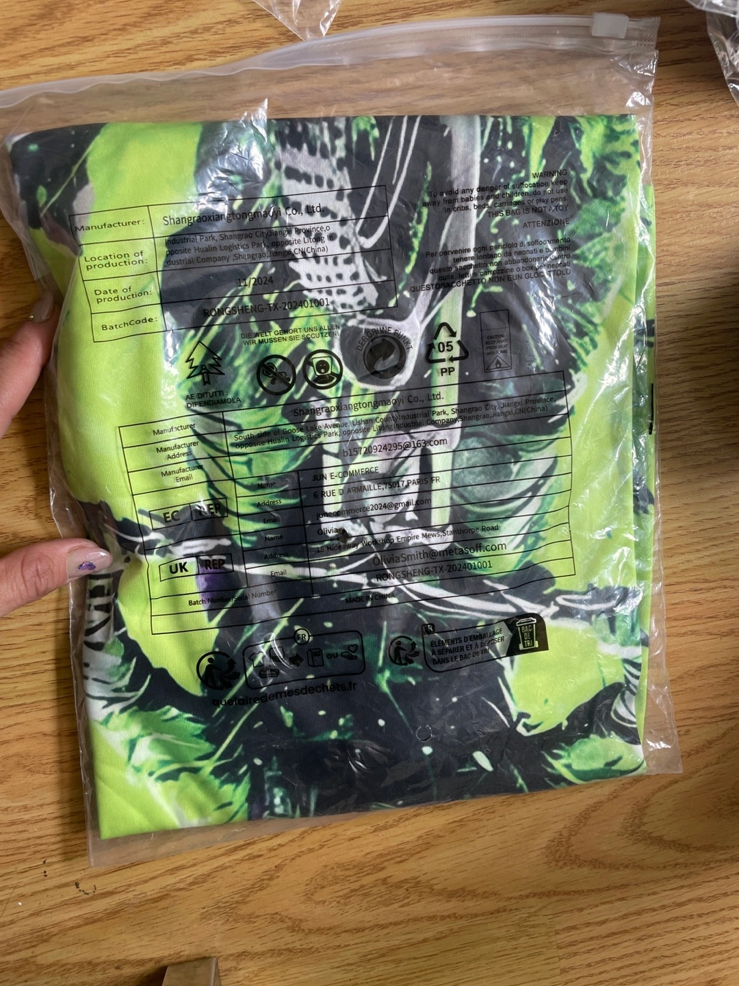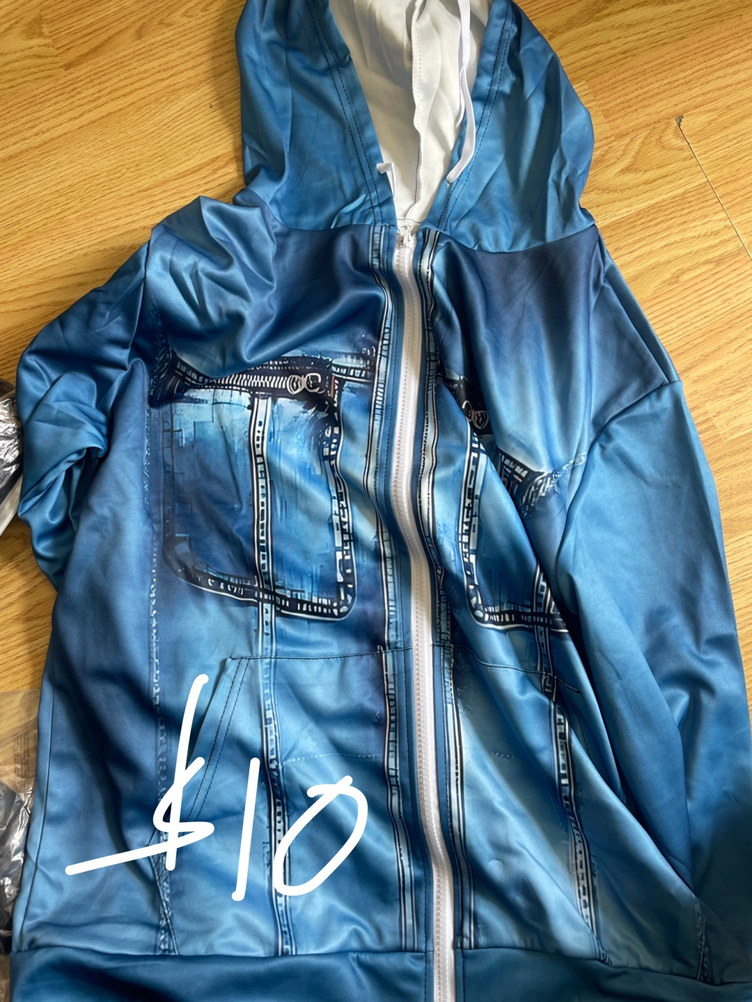 Bundle includes a men's zip-up denim print hoodie, five various-coloured short-sleeved t-shirts, a green golf polo shirt, and 1 duvet covers. Sizes and styles vary.