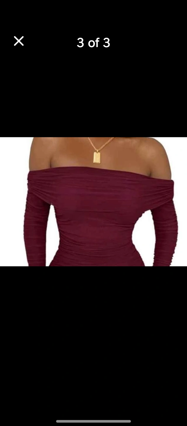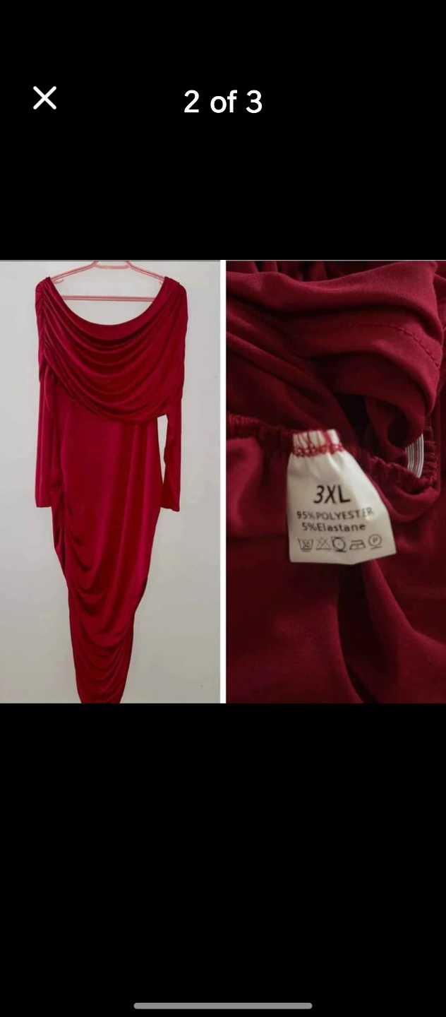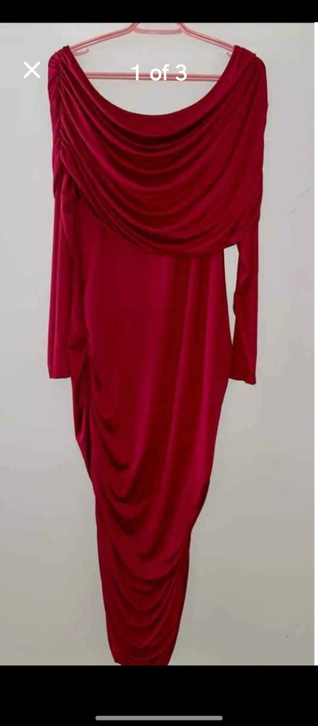 Stunning burgundy maxi dress. Off-the-shoulder design, long sleeves, and a figure-flattering silhouette. Draped bodice and asymmetrical hemline. Size 3XL. 95% polyester, 5% spandex.