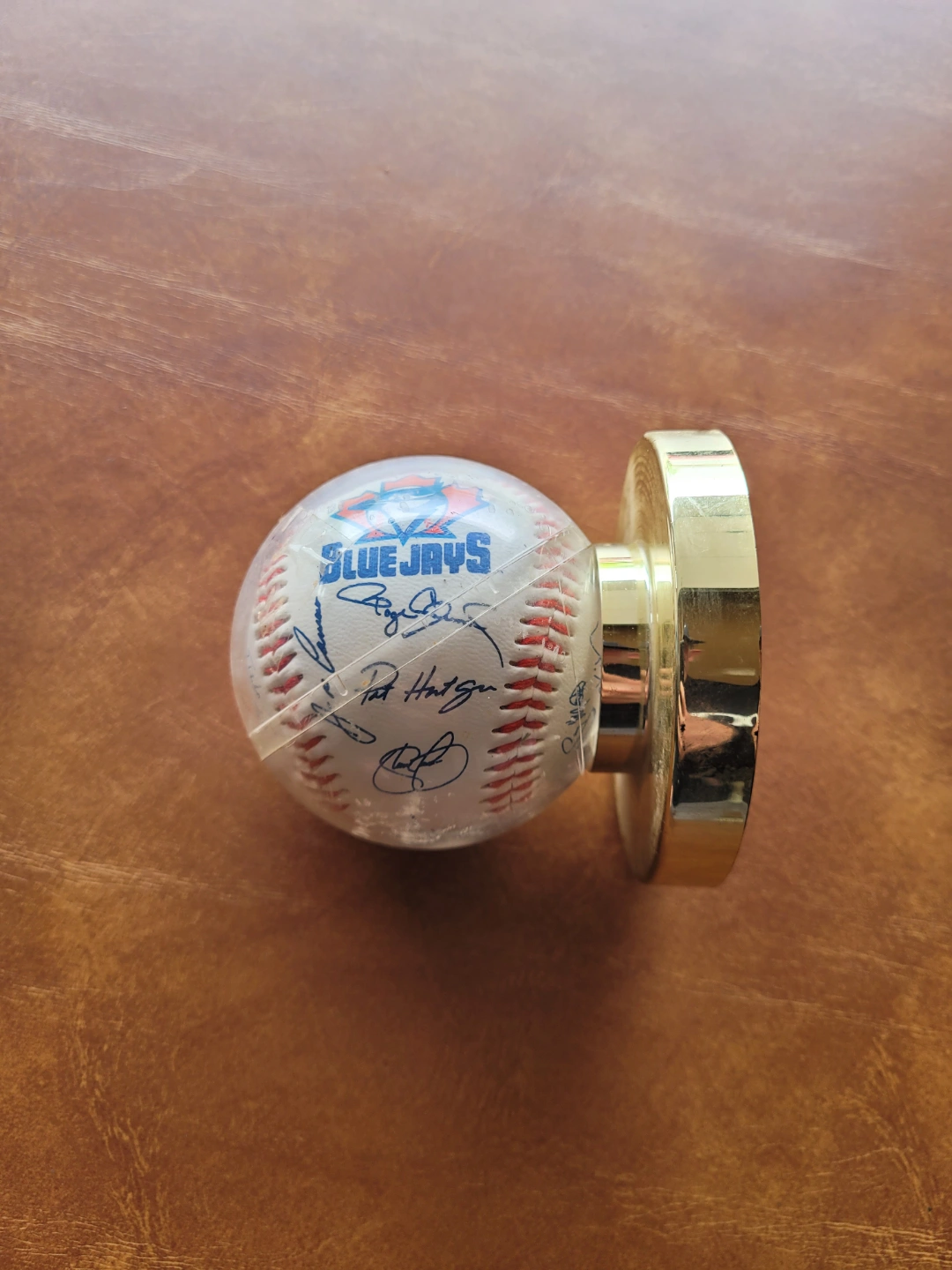 Collectible baseball features multiple signatures. Toronto Blue Jays logo visible. Presented in a gold-toned display stand. Minor wear may be present.