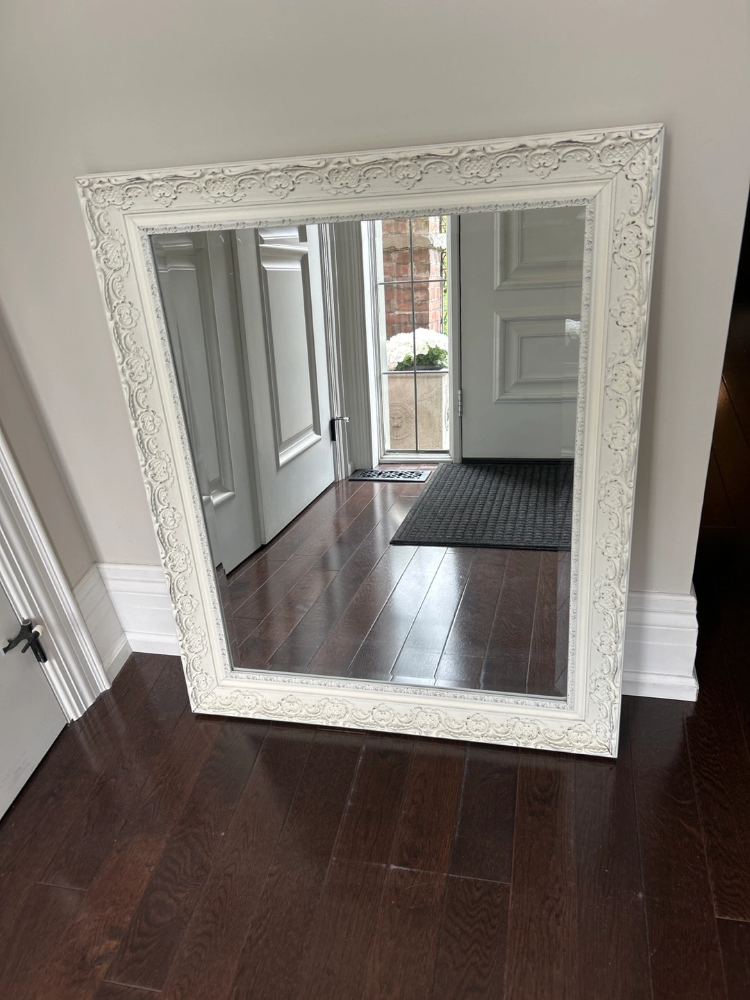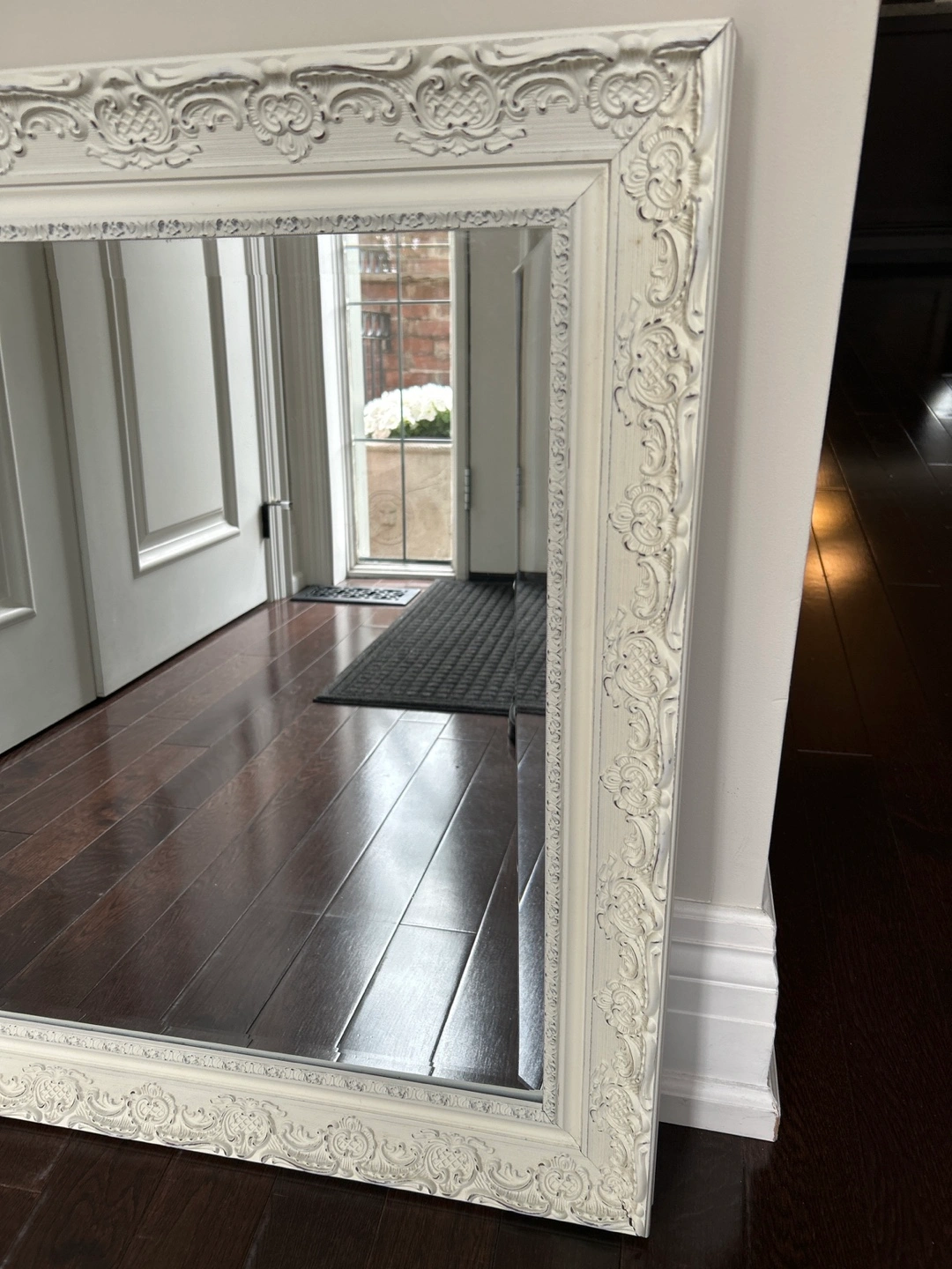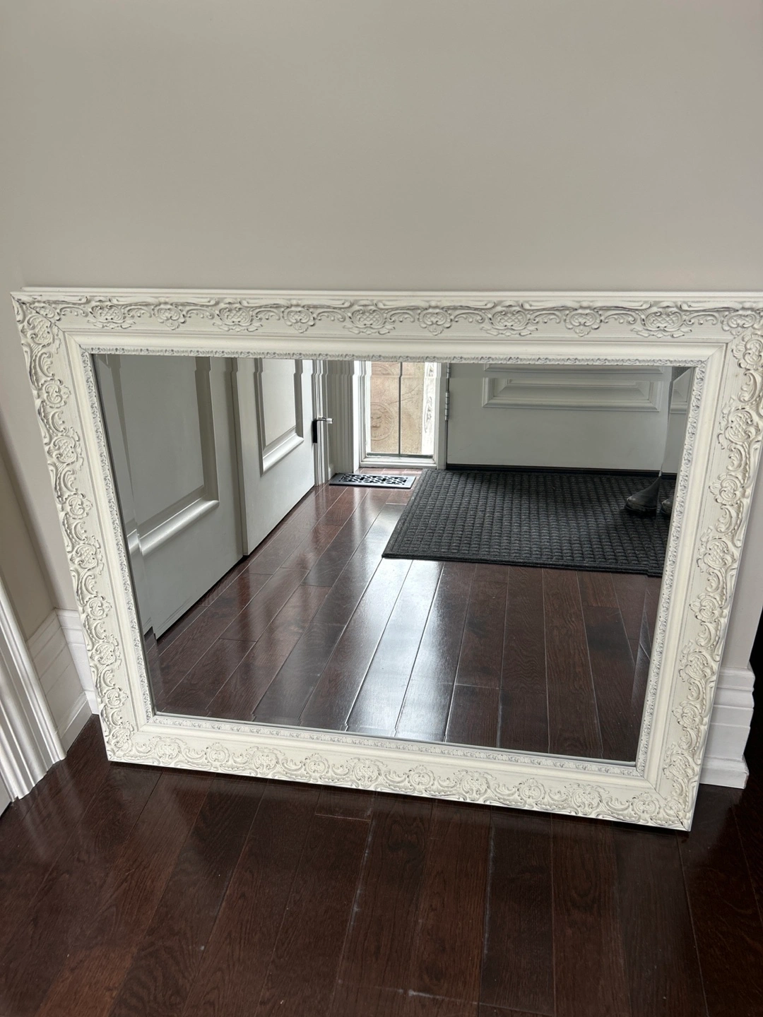 246Large rectangular mirror. Creamy white ornate frame. Good condition. Hangs vertically or horizontally. Ready to hang. Retails for over $300 on Wayfair.