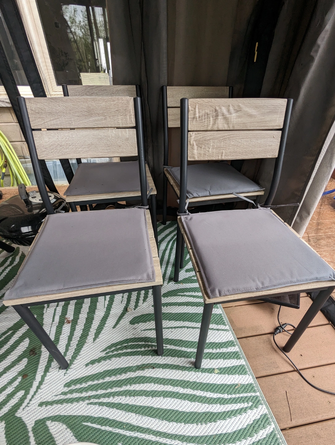 Buy & SellSet of Four Outdoor Patio ChairsSet of Four Outdoor Patio Chairs$80Four grey cushioned patio chairs. Black metal frame. Light wood seat and back. Perfect for outdoor entertaining.1 chats·1 favorites·113 viewsSELLEREricStouffville262 reviewsWHERE TO MEETRichmond Hill Centre
