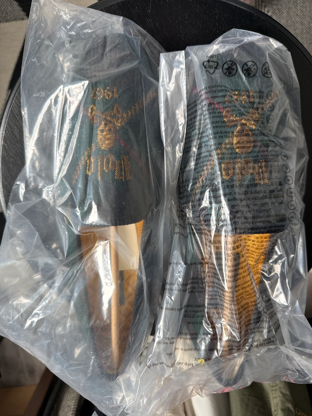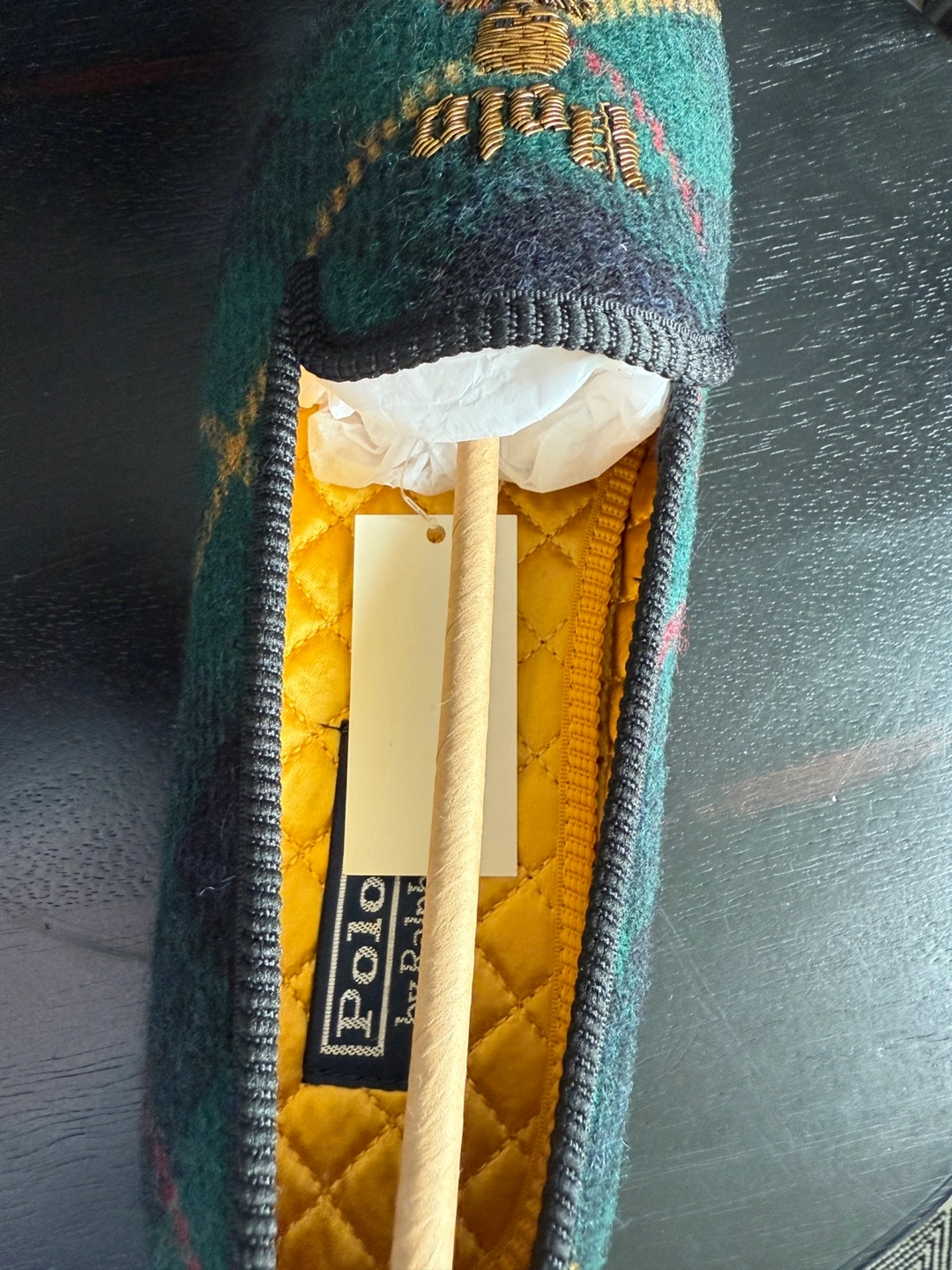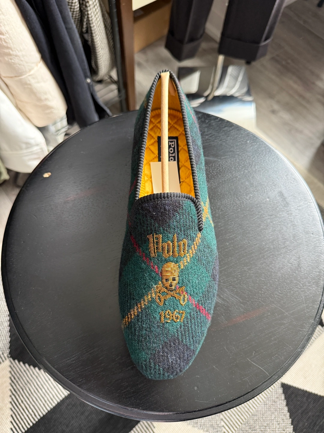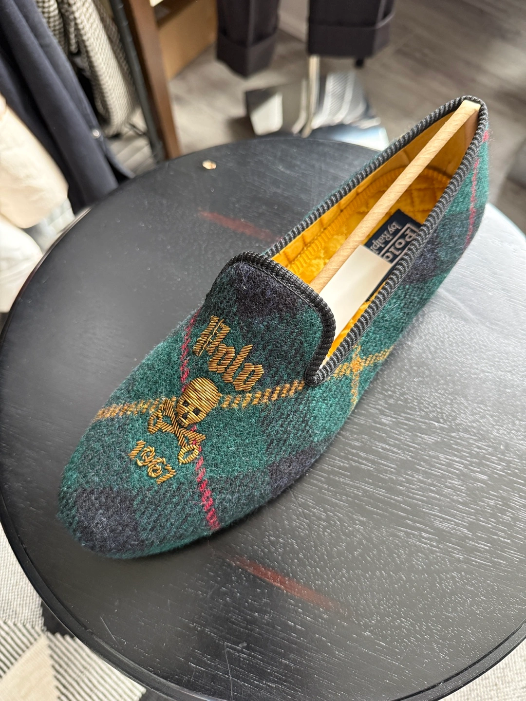 Green plaid pattern. Embroidered Polo logo and skull. Leather sole. New with tags.