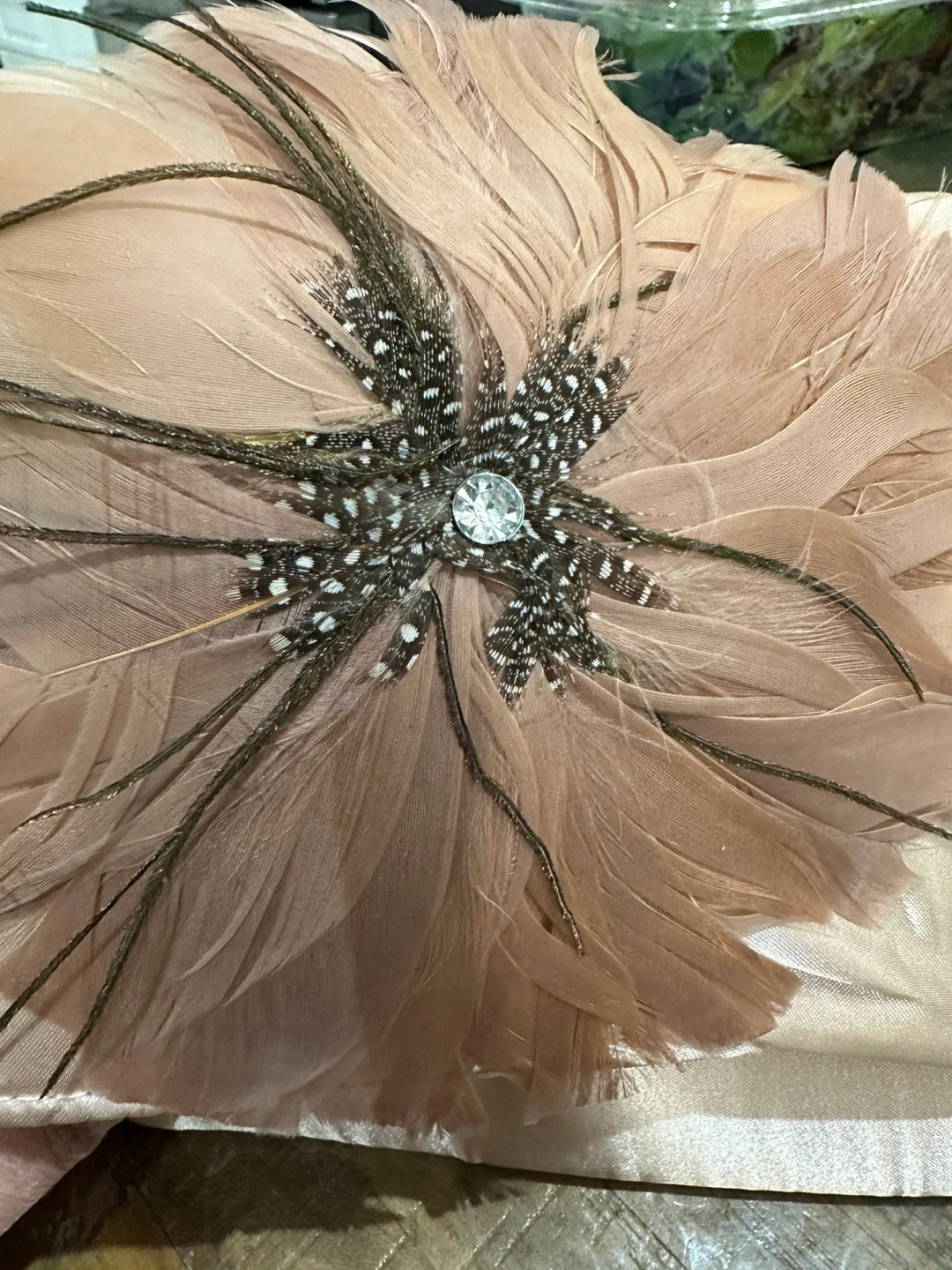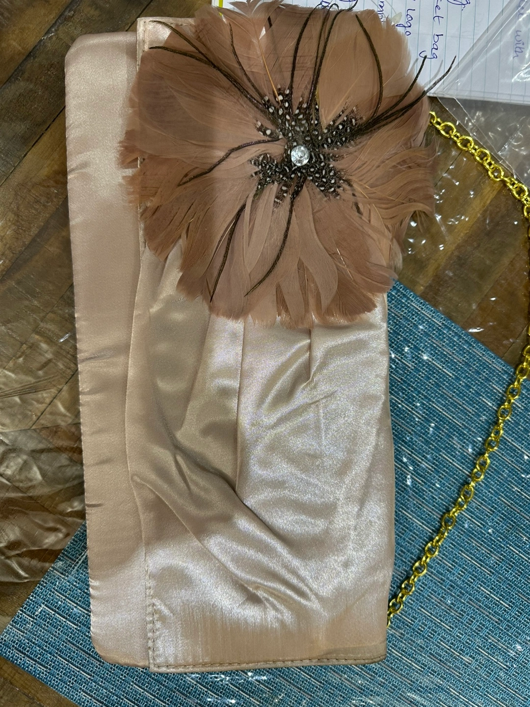 54Beautiful blush pink satin clutch. Features a stunning feather embellishment with rhinestone centre. Gold chain strap. Perfect for evening events.