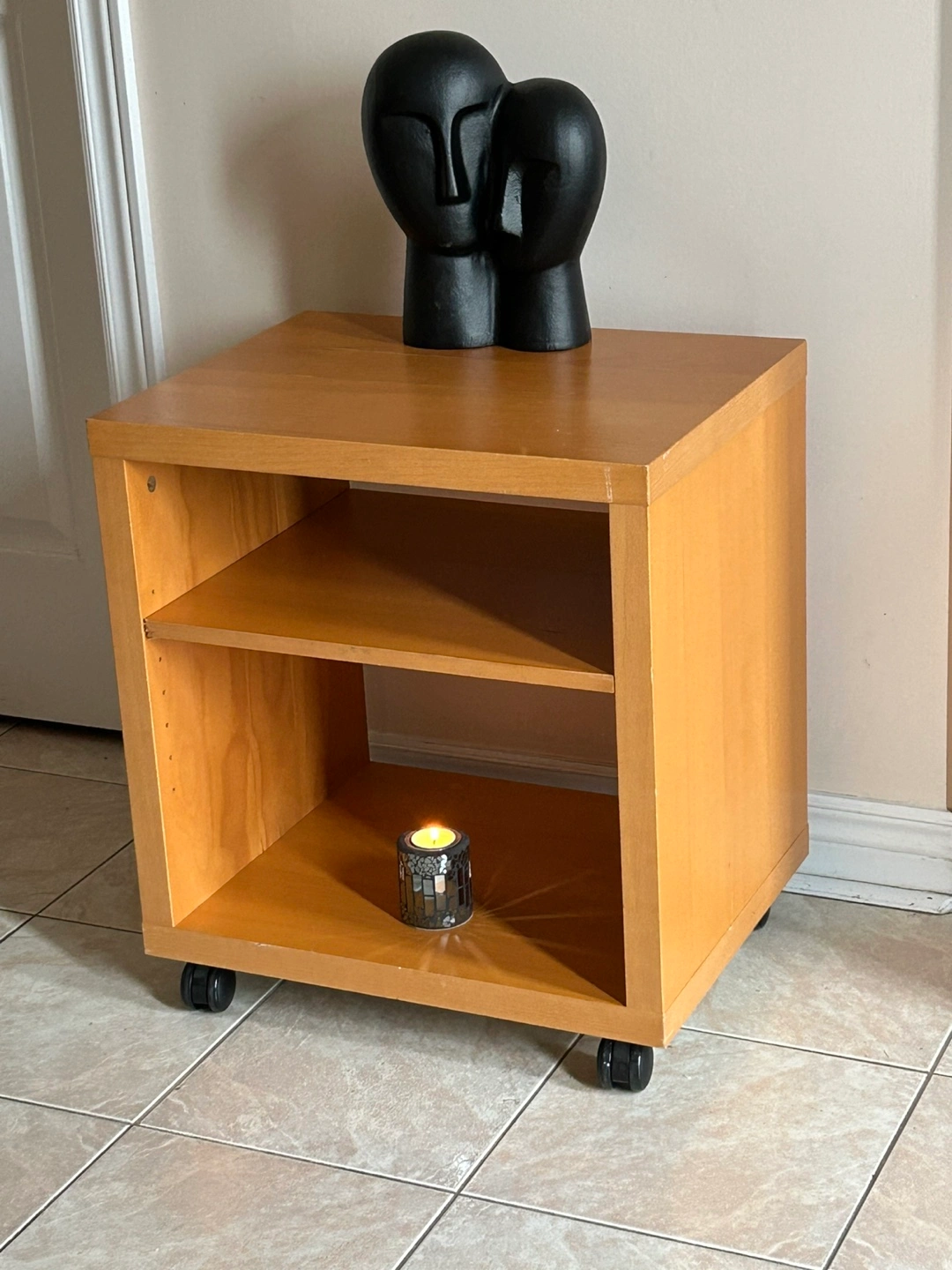 Small wooden storage unit. Two shelves. Four rolling casters. Light wood colour. Perfect for small spaces.