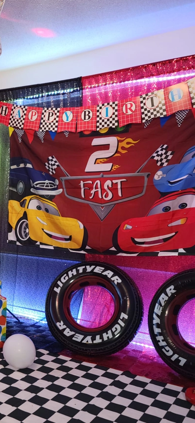 230Cars themed party backdrop. Includes banner, large backdrop, Perfect for a second birthday.