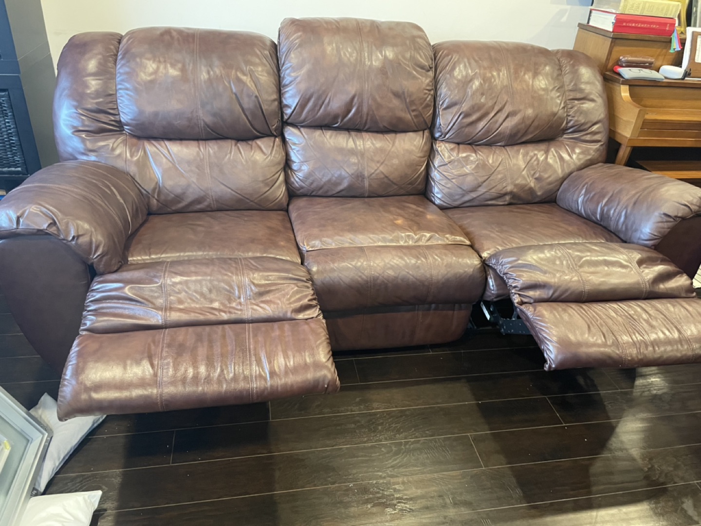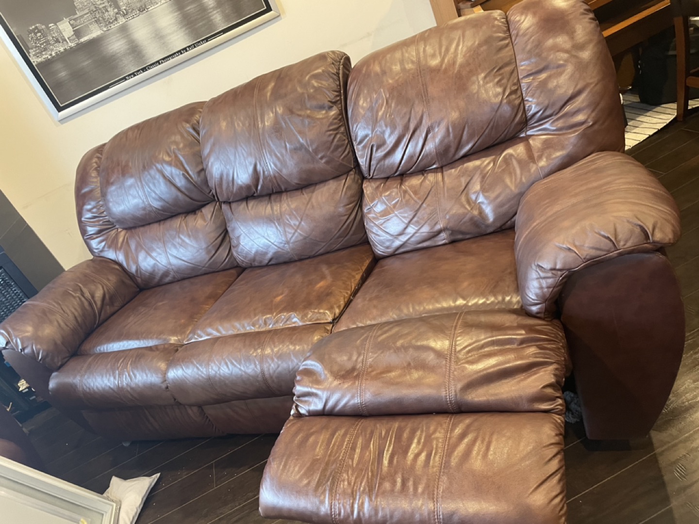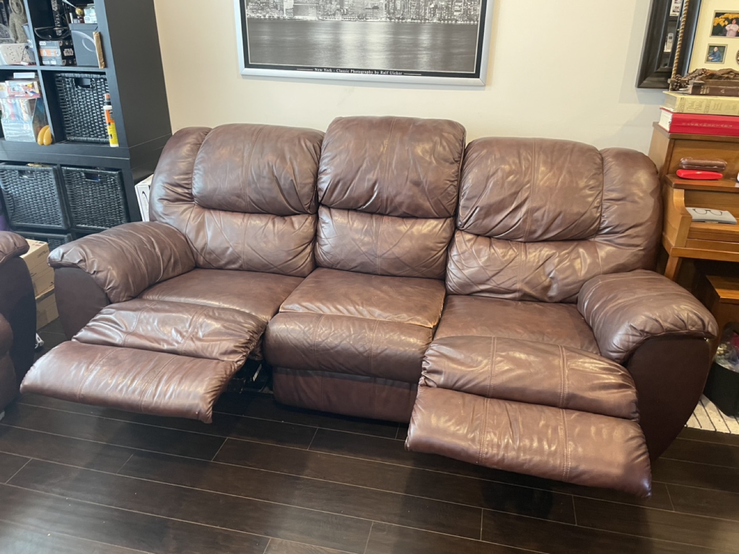 5As is Ashley Used Reclining Leather Sofa (minimum 2 small scratches/regular wear & tear/7 yrs+)(Selling matching Reclining Leather Loveseat for $300/matching Reclining Leather Chair for $200)(Will sell Sofa/Loveseat for $600 or all 3 for $700+Ottoman for free when you buy whole 3 as a set)(Pick up only)(Cash/Etrasfer)