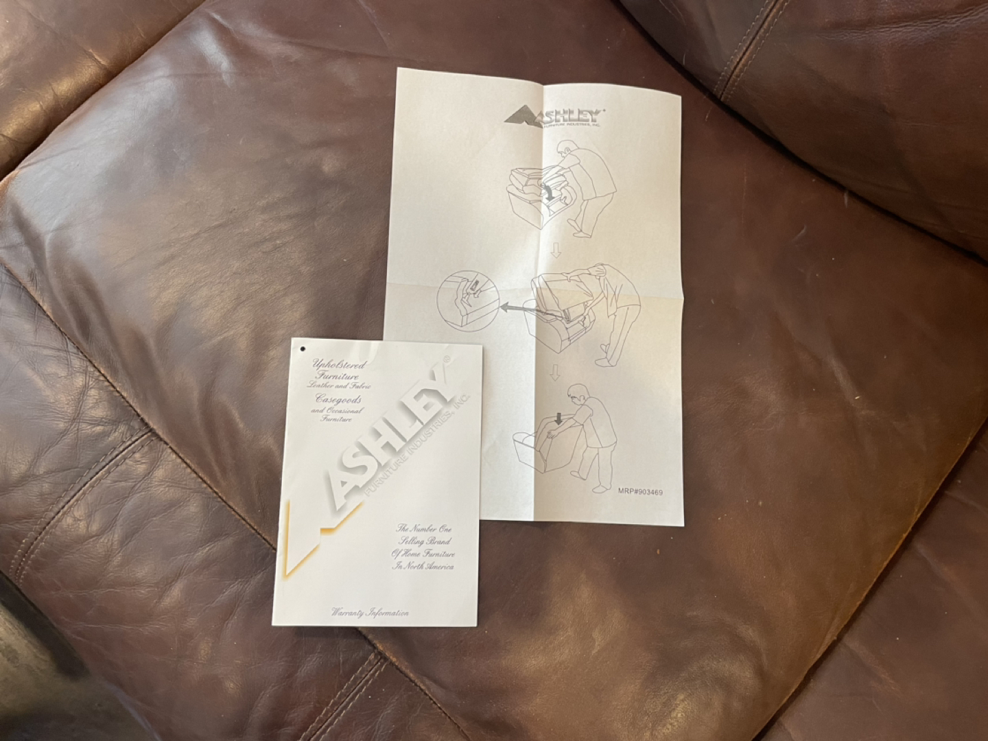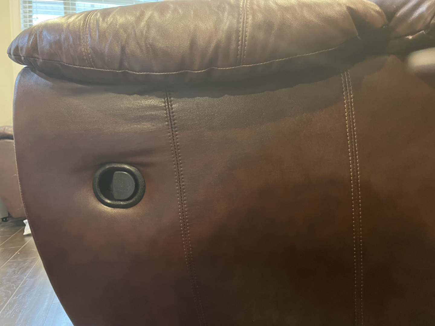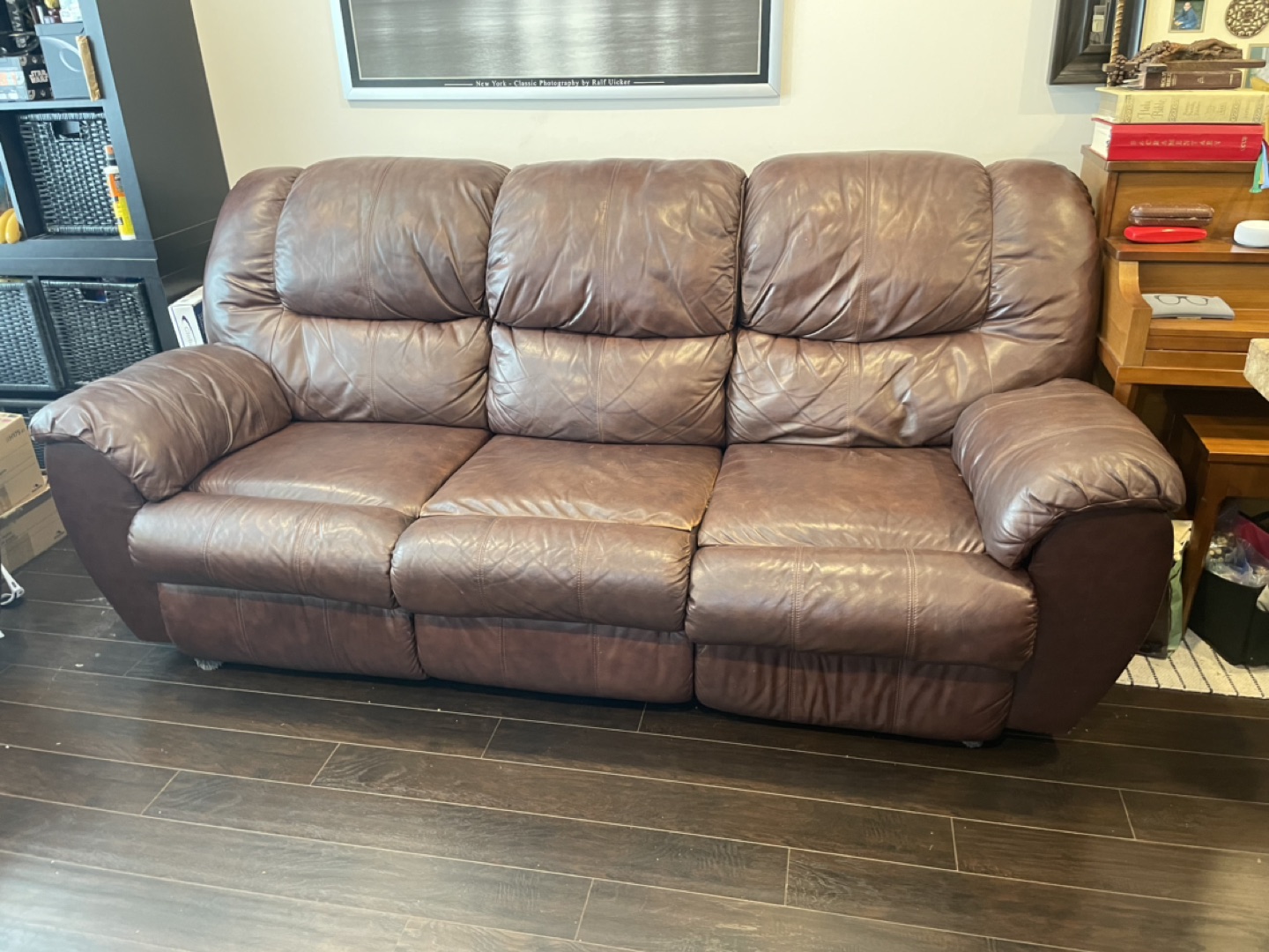 5As is Ashley Used Reclining Leather Sofa (minimum 2 small scratches/regular wear & tear/7 yrs+)(Selling matching Reclining Leather Loveseat for $300/matching Reclining Leather Chair for $200)(Will sell Sofa/Loveseat for $600 or all 3 for $700+Ottoman for free when you buy whole 3 as a set)(Pick up only)(Cash/Etrasfer)