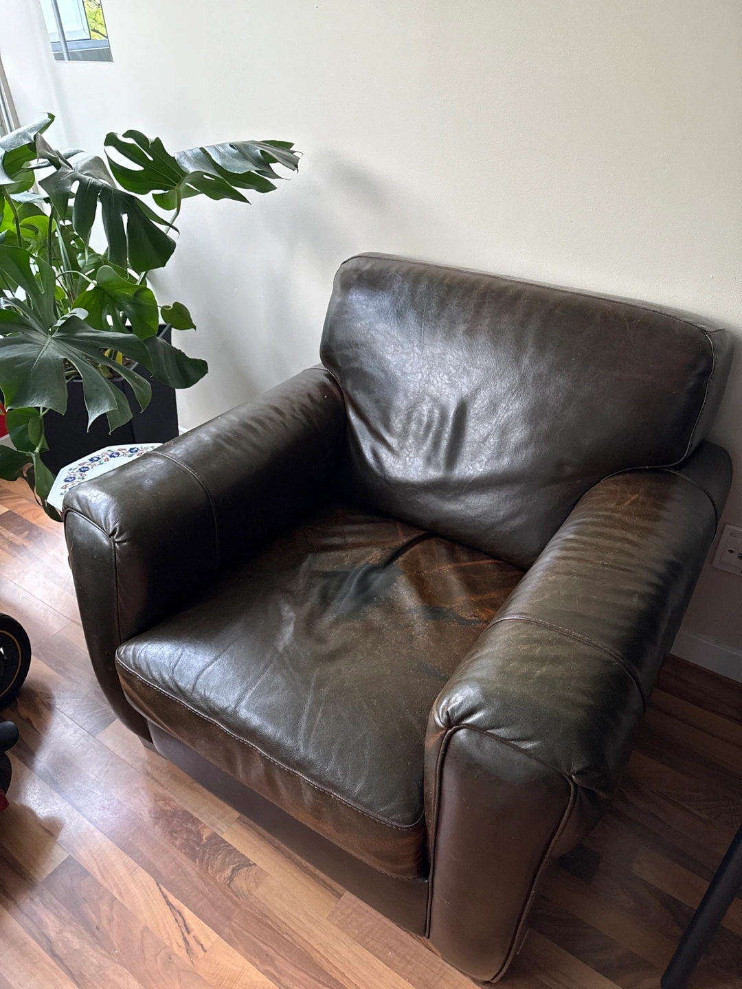 Comfortable dark brown leather armchair. Shows some wear. Classic design. Solid wood legs. Perfect for a living room or office (free)