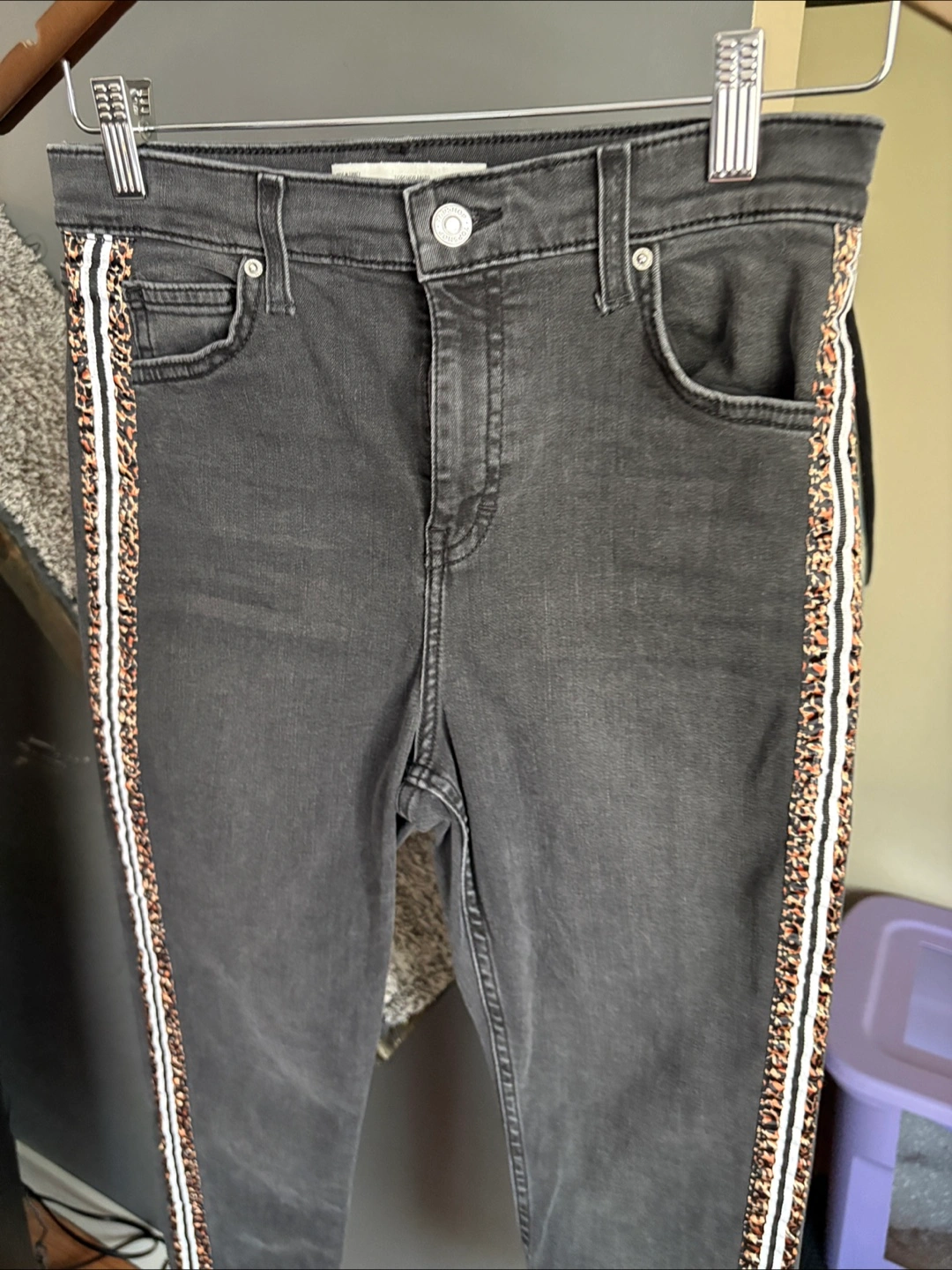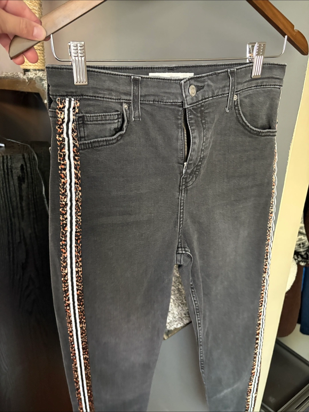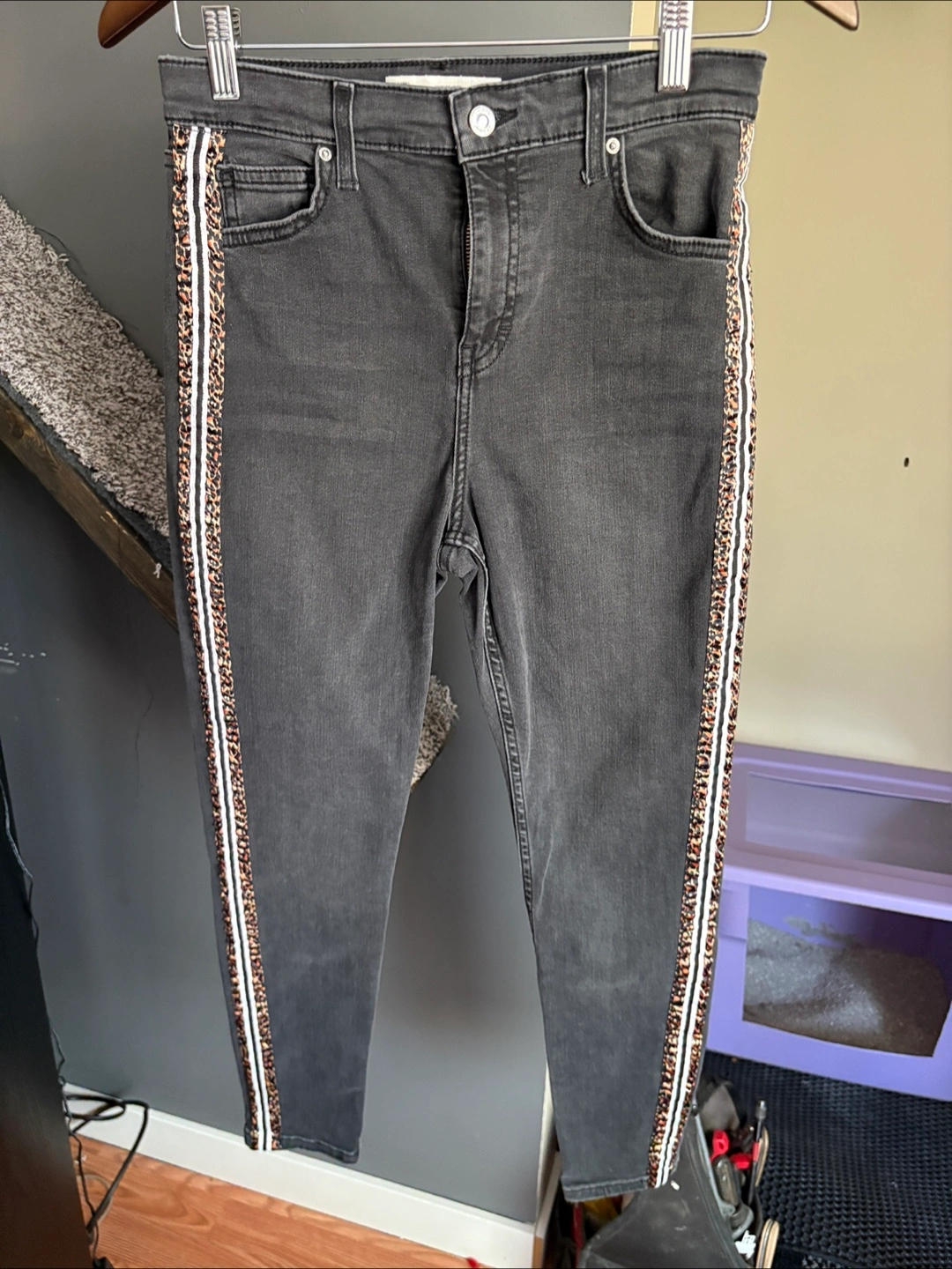 Dark grey skinny jeans. Leopard print and white stripe detailing on the sides. Size 30. Zip fly. New Condition