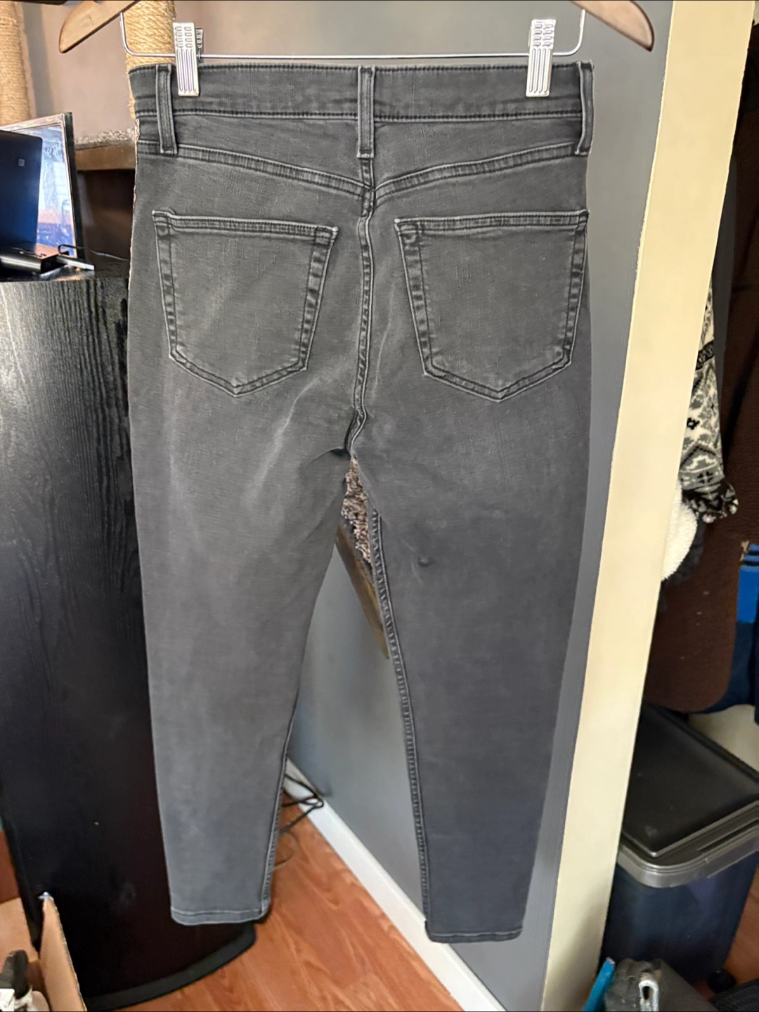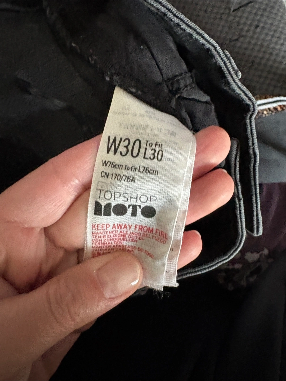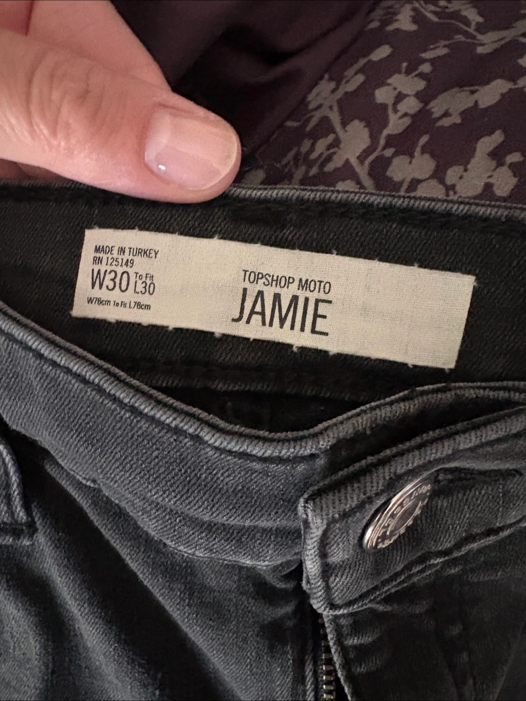 Dark grey skinny jeans. Leopard print and white stripe detailing on the sides. Size 30. Zip fly. New Condition