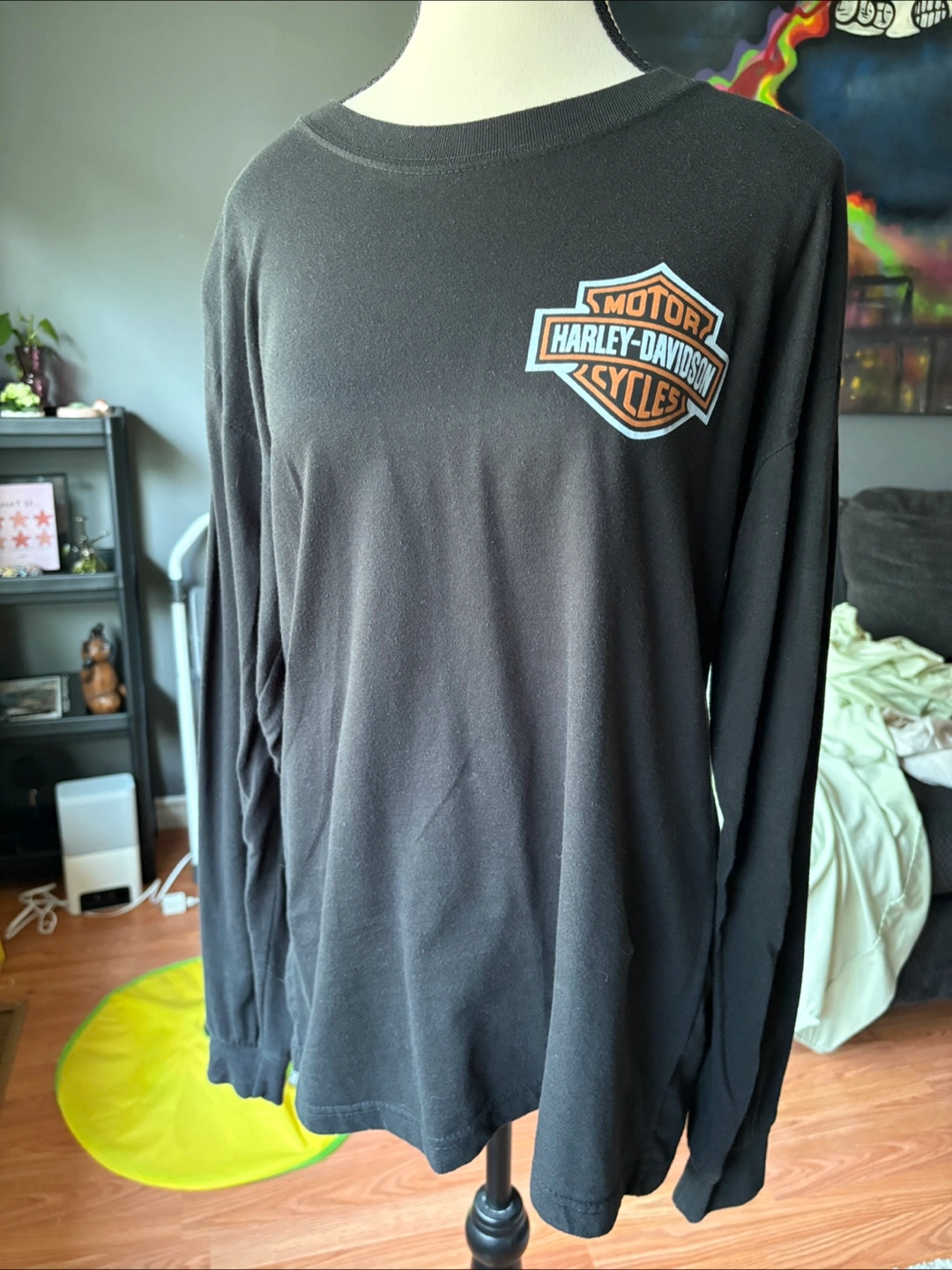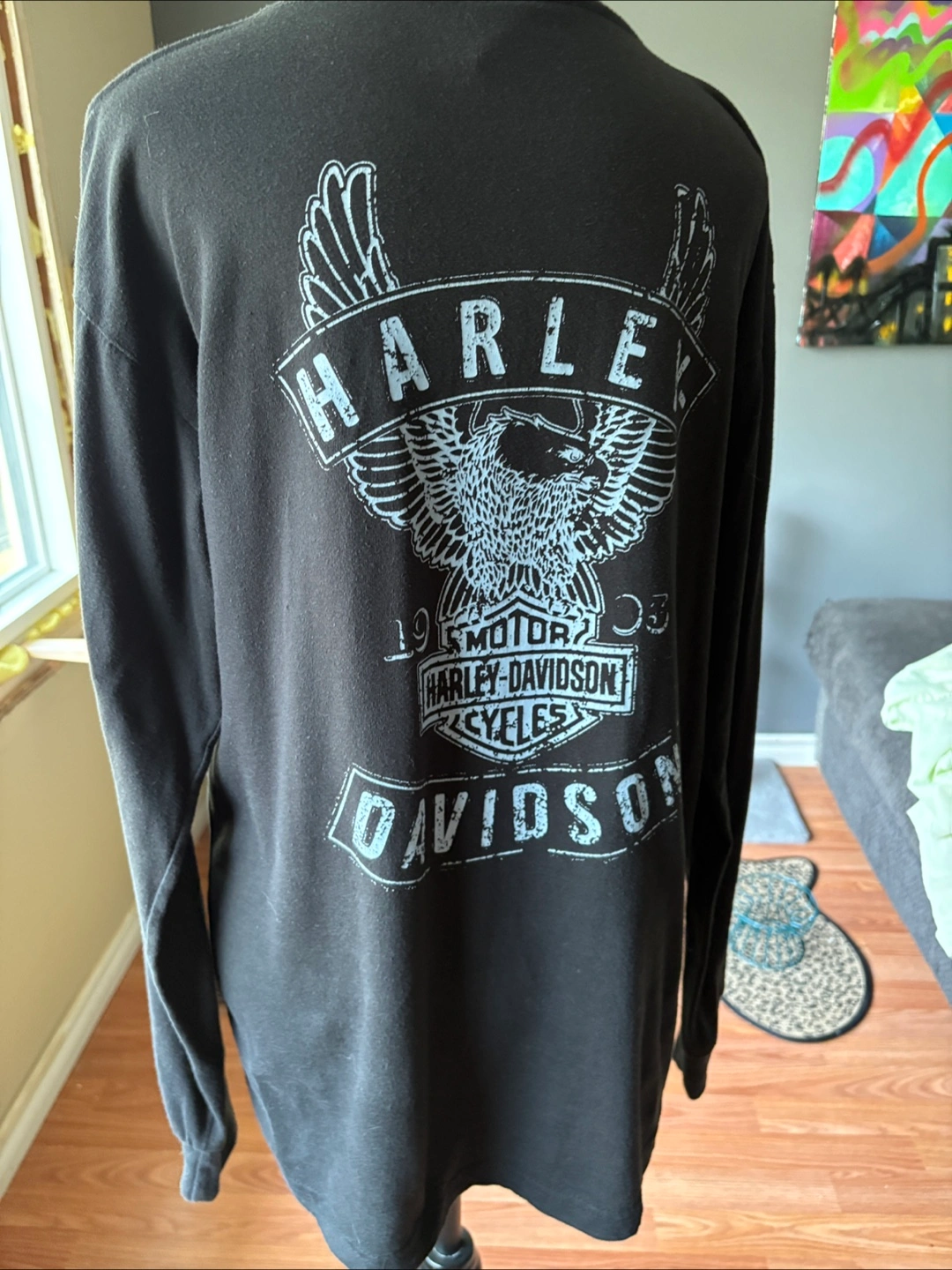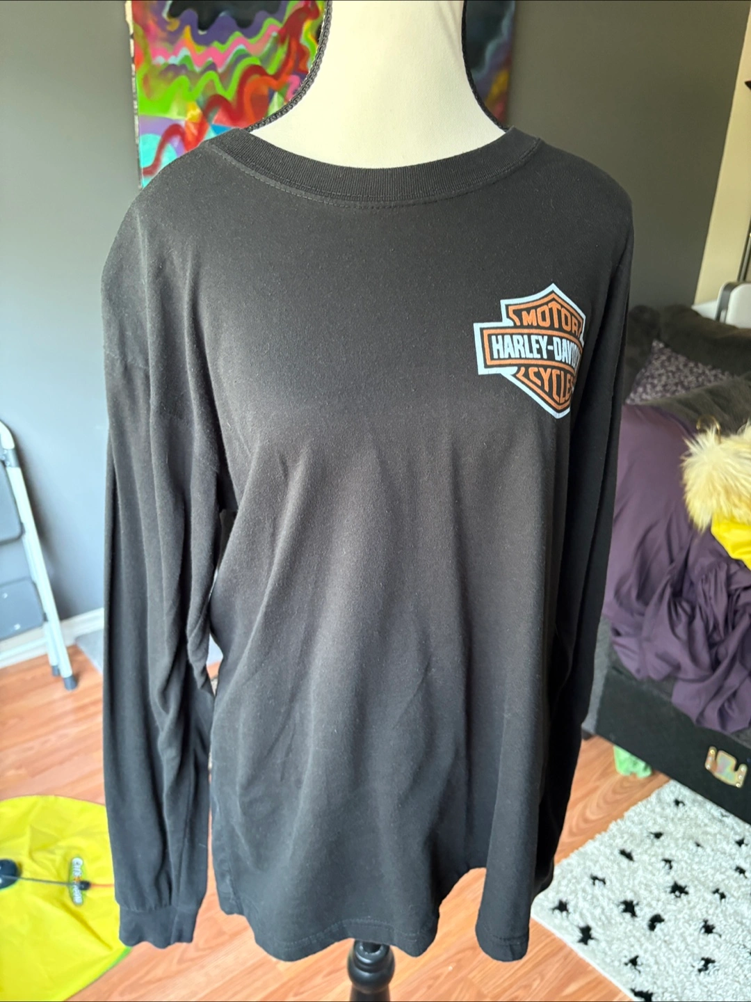 Black long sleeve shirt. Features Harley Davidson logo on the front and back. Great for casual wear.