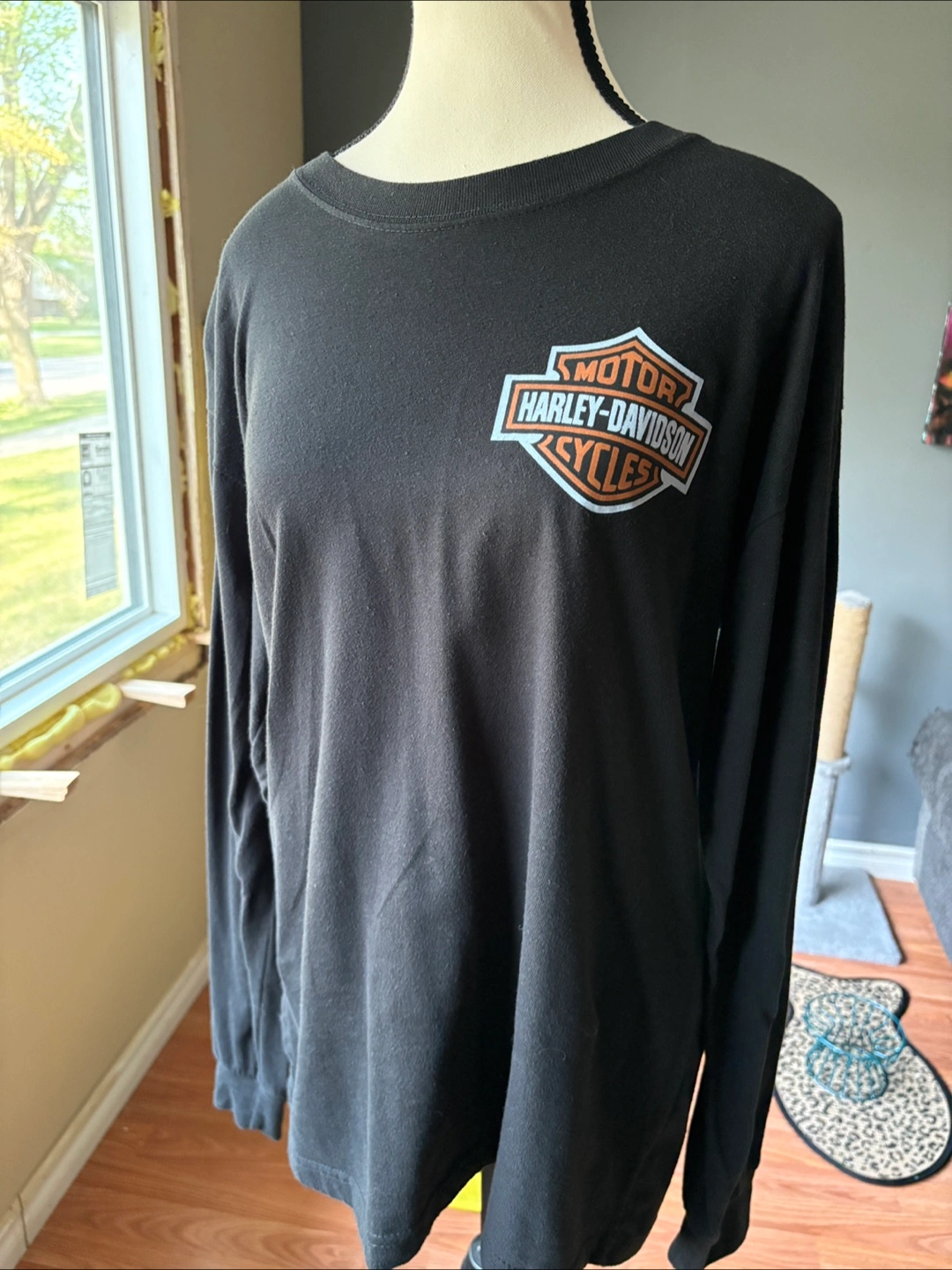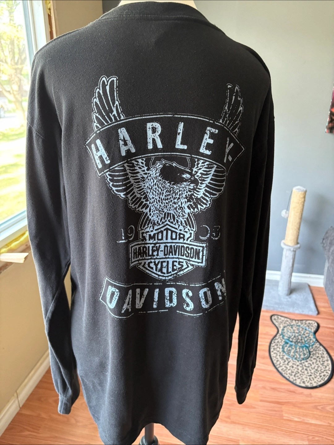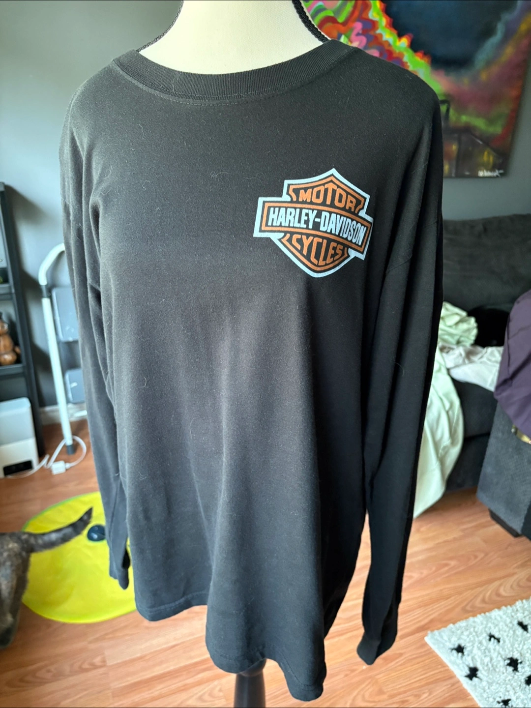 Black long sleeve shirt. Features Harley Davidson logo on the front and back. Great for casual wear.