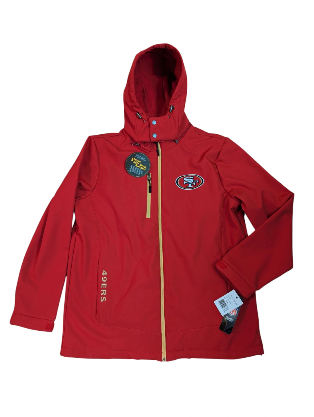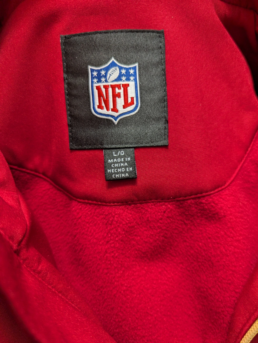 The product is a G-III NFL Team Apparel San Francisco 49ers Full Zip Jacket in size L. It is officially licensed by the National Football League (NFL) and designed for men. The jacket is red in color and features the team logo and branding. Perfect for showing support for the San Francisco 49ers.