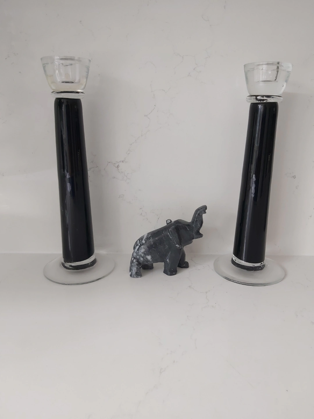 Marble baby elephant. Black and grey. Trunk points up which is good luck. Nice in a cabinet collection. Solid weight. No damage. Cute and unique.