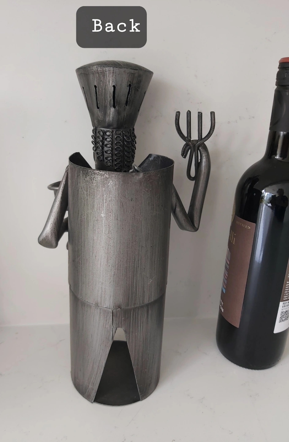 Knight in shining armour wine holder. Gray metal. Holds a bottle of wine. His head is the wine bottle topper. Very unique and a wonderful gift.