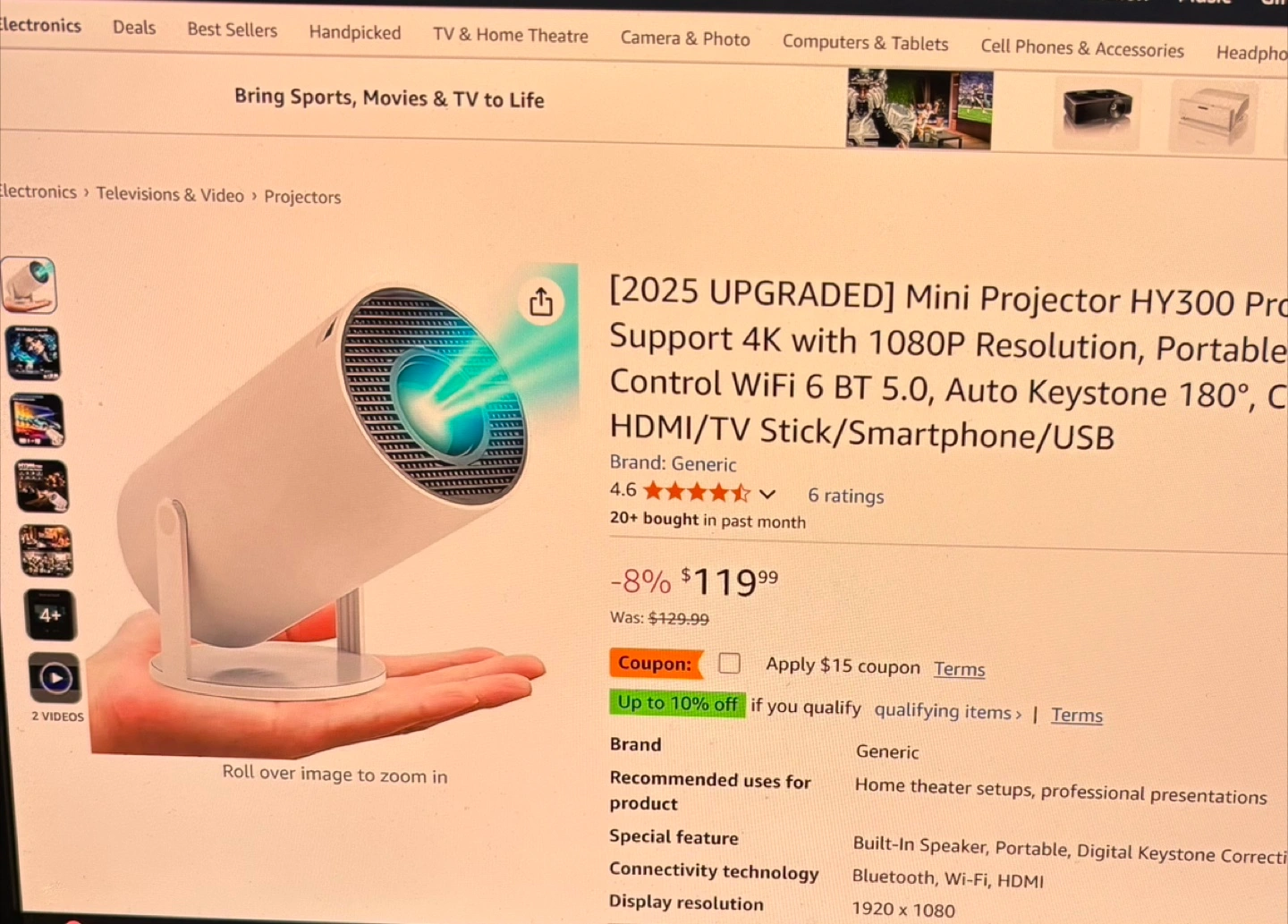 Portable projector. Supports 4K with 1080P resolution. Includes remote. Features WiFi, Bluetooth, HDMI, and USB connectivity. Auto keystone correction.