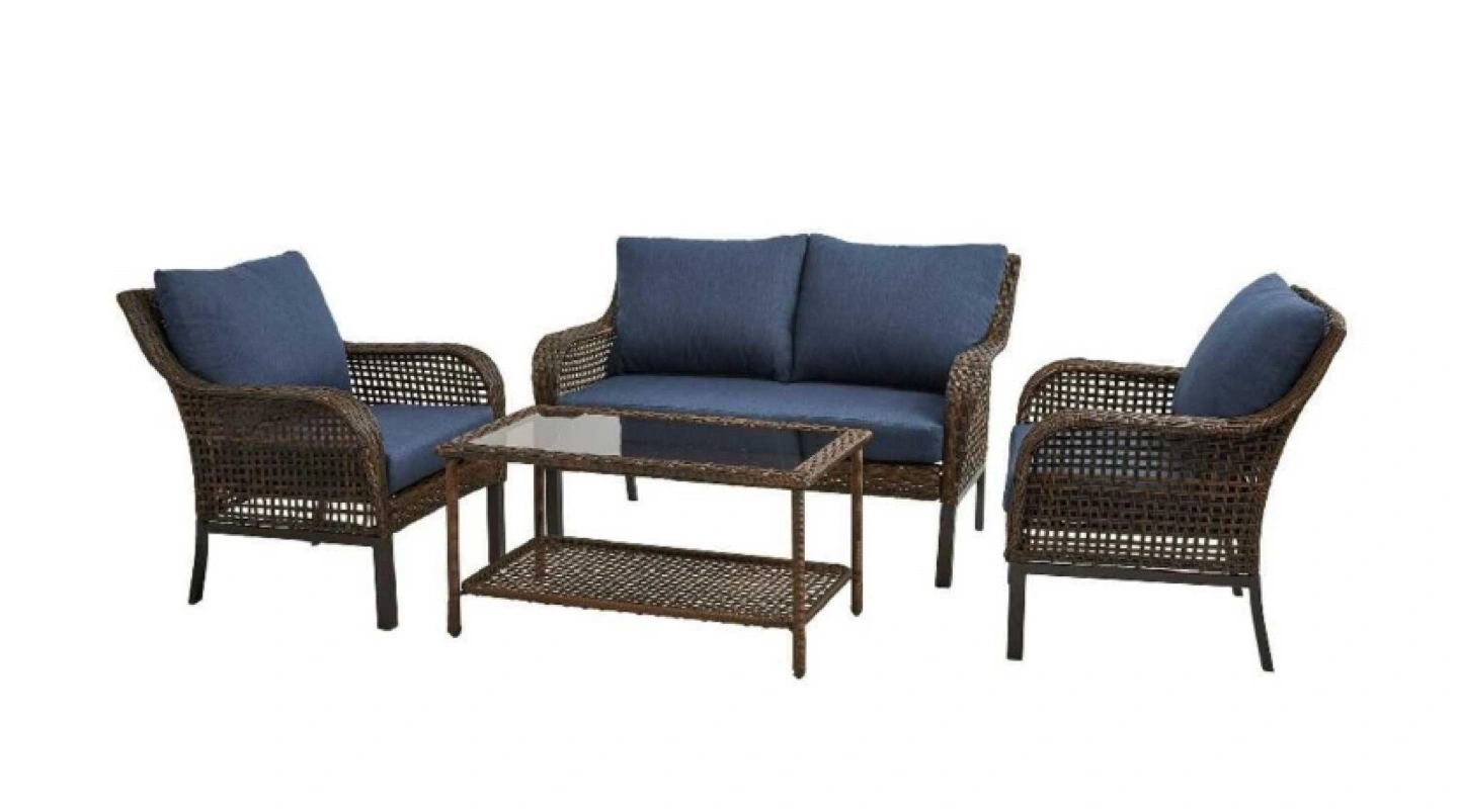 The set features handwoven, all-weather synthetic wicker wrapped around powder-coated, rust-resistant steel frames. The cushions are made from UV- protected Olefin fabric. It is designed for outdoor use and is suitable for patios, balconies, or other outdoor spaces. The set is designed to inspire conversation and relaxation.