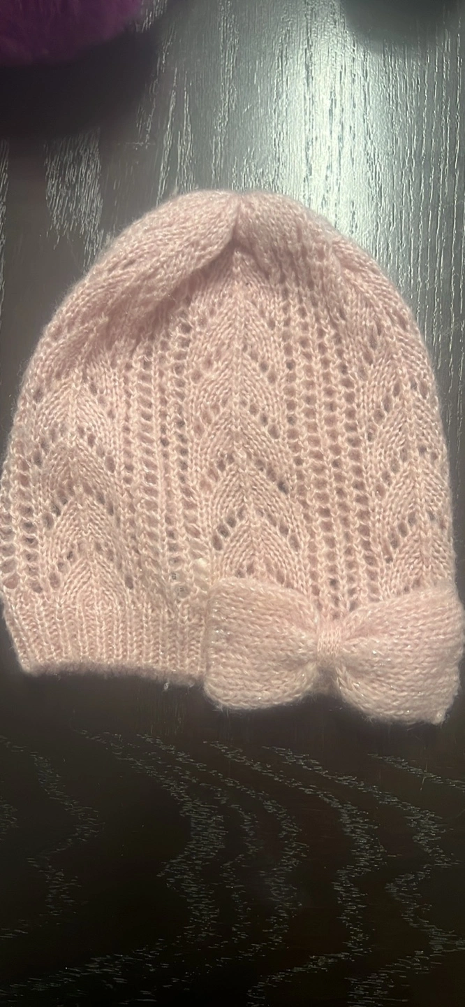 Adorable pink baby hat. Lightweight knit material. Features a cute little bow. Perfect for a photoshoot or everyday wear. Size 2-3