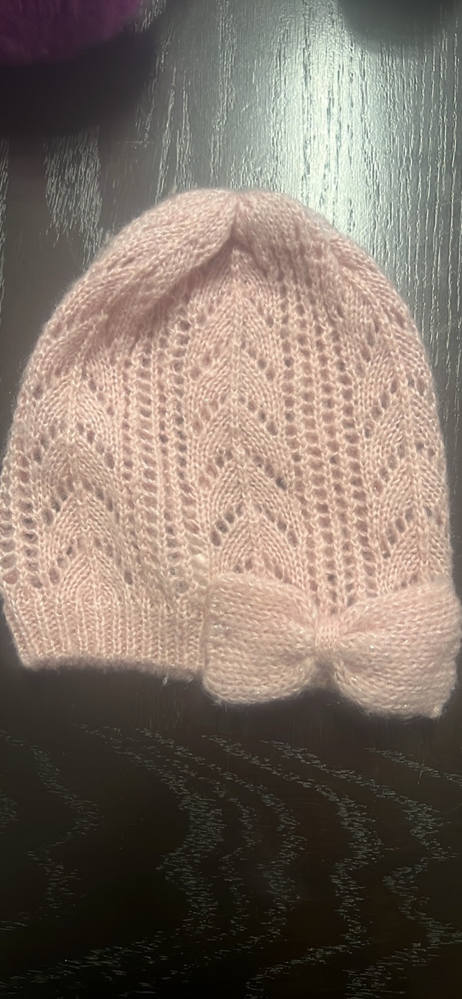 Adorable pink baby hat. Lightweight knit material. Features a cute little bow. Perfect for a photoshoot or everyday wear. Size 2-3