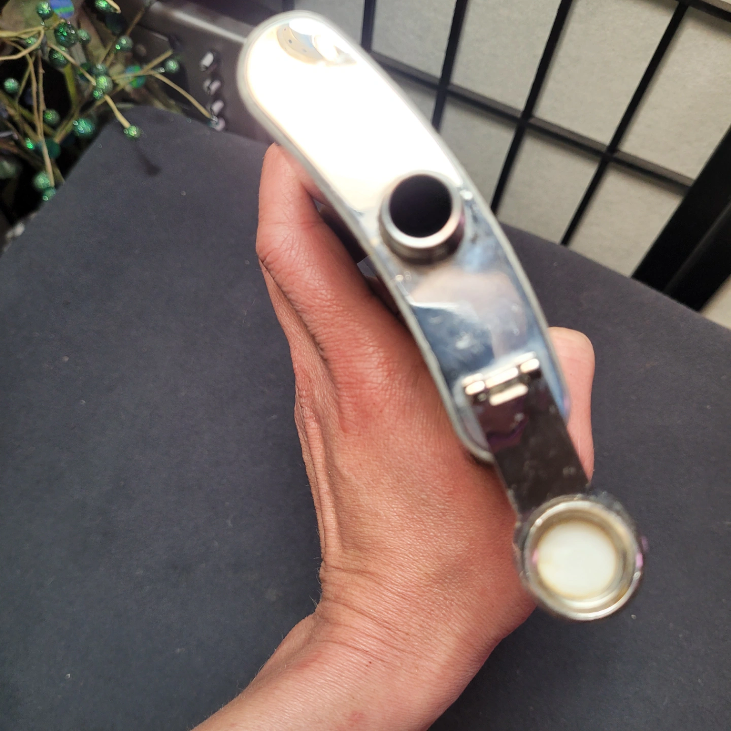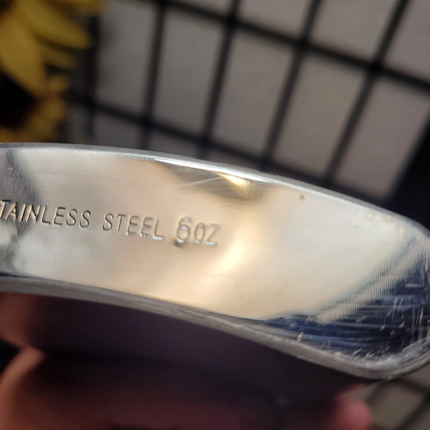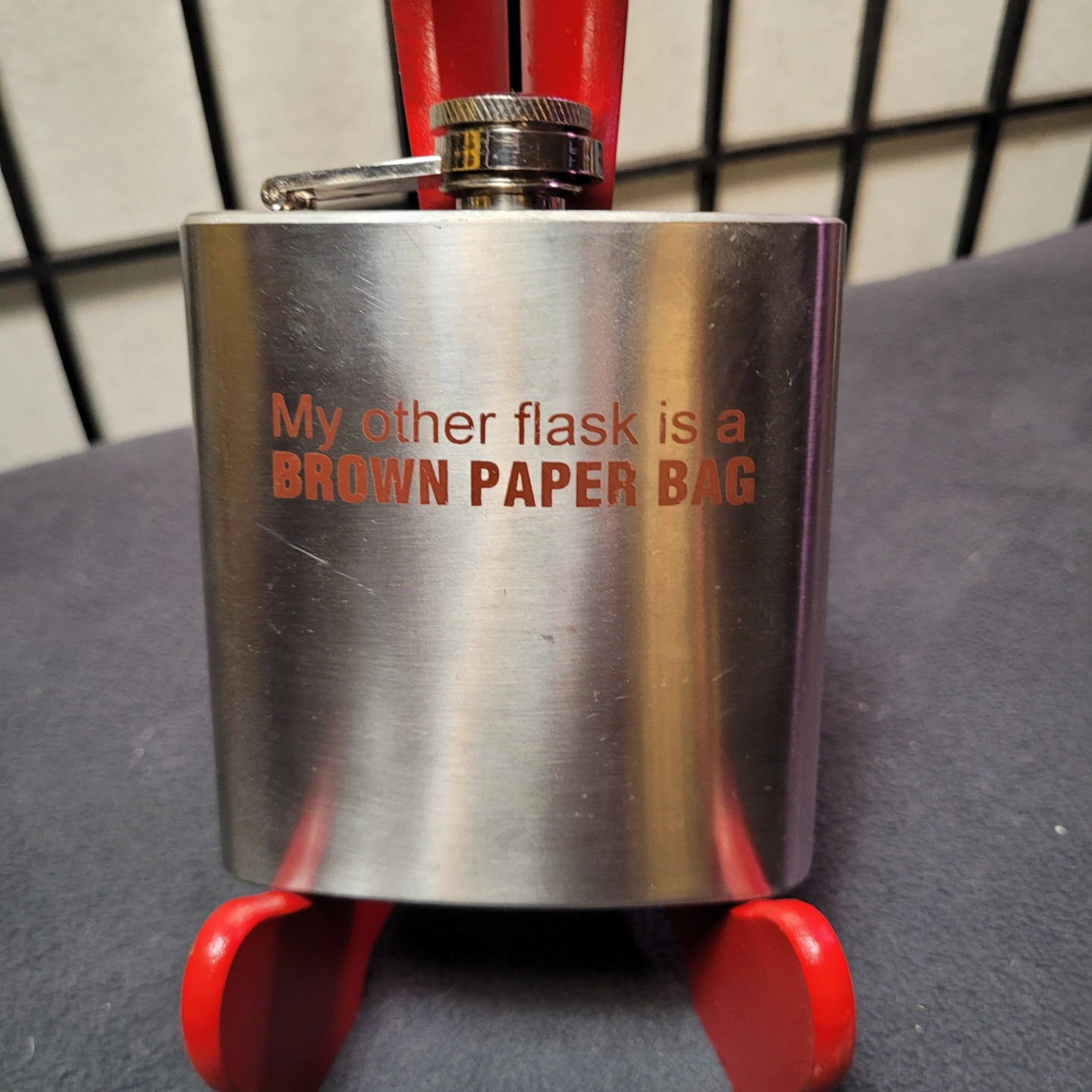 Stainless steel hip flask. Holds 6oz. Features a funny, engraved saying: "My other flask is a brown paper bag". Includes a hinged cap.