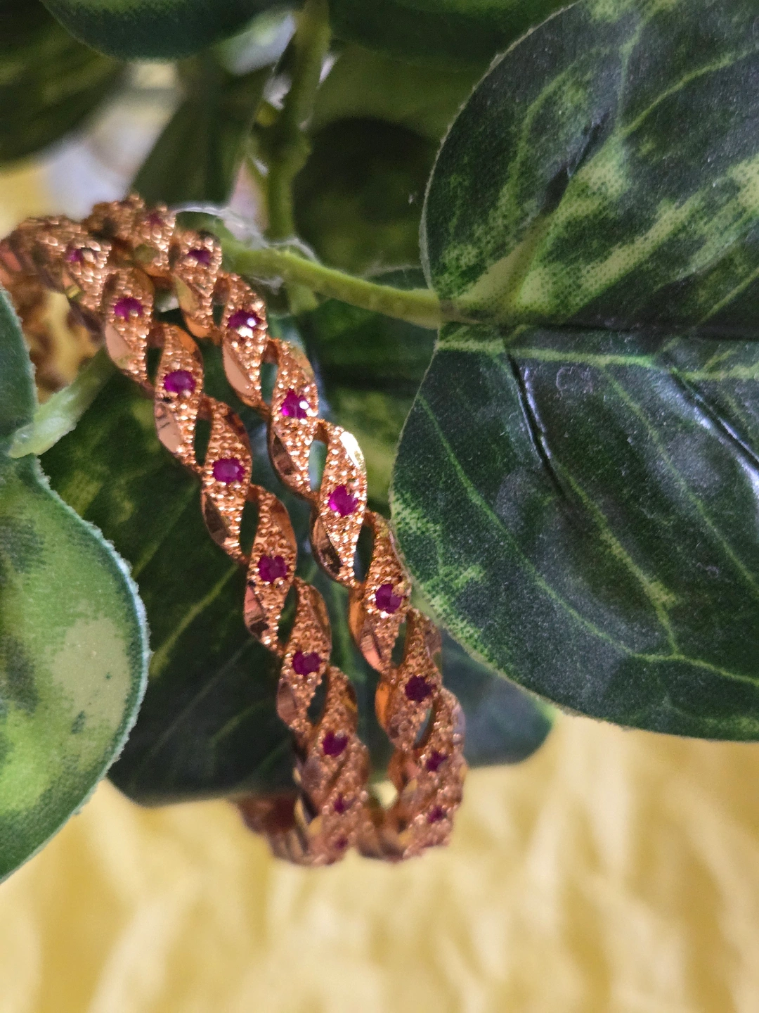 66Pair of gold bangles. Intricate design. Pink stones embellish the bangles. Beautiful and elegant.daily wear.