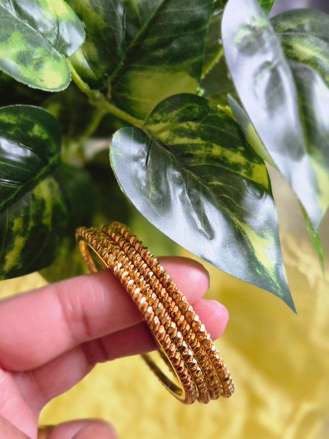 66Set of four gold-toned bangles. Beaded texture. Lightweight and stylish.daily wear bangles