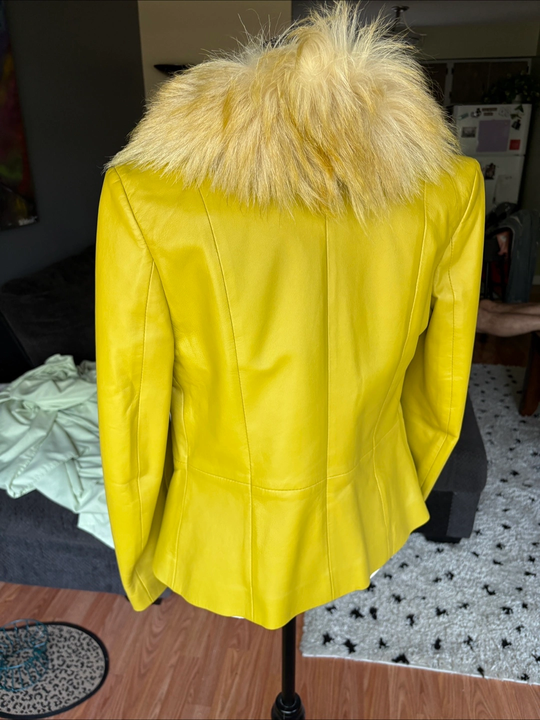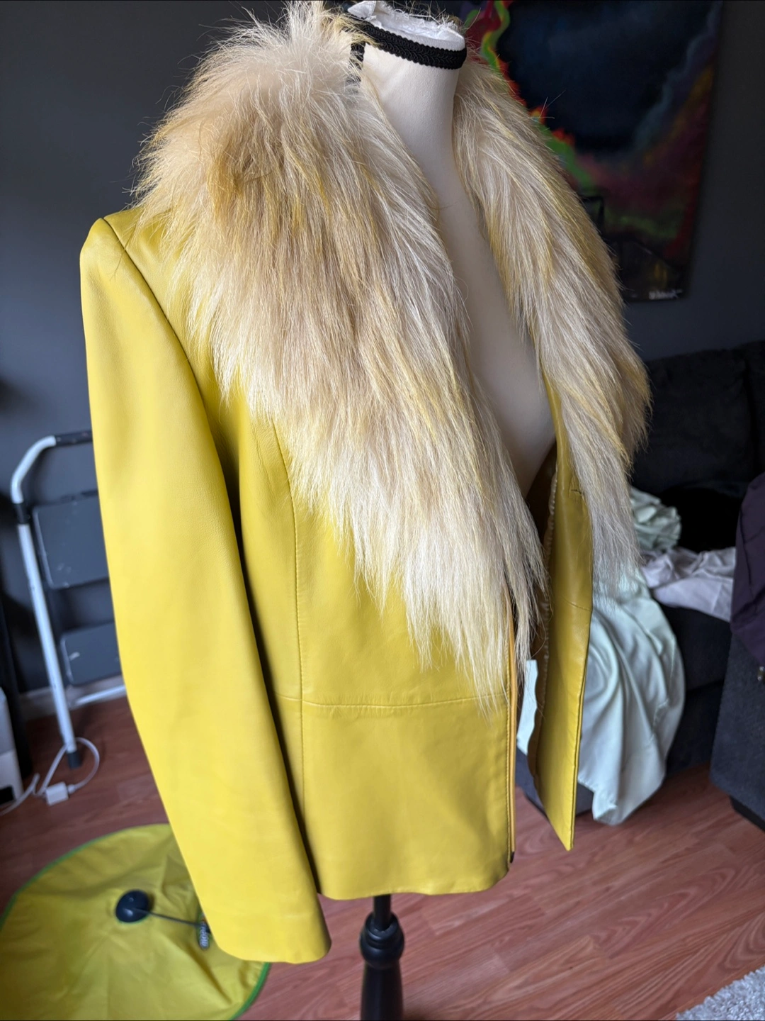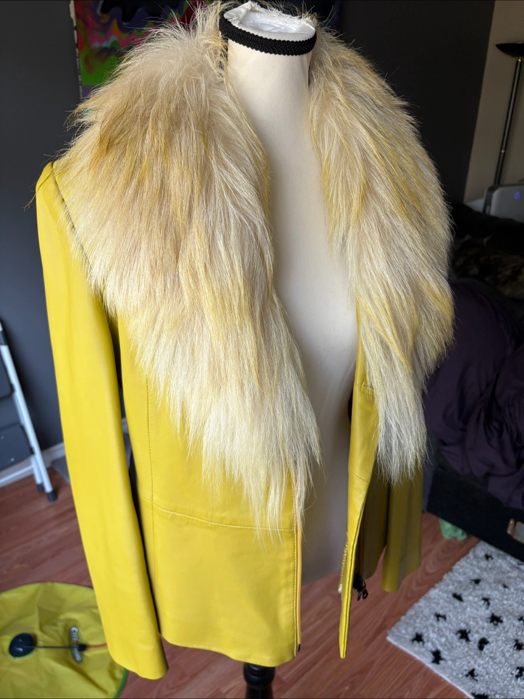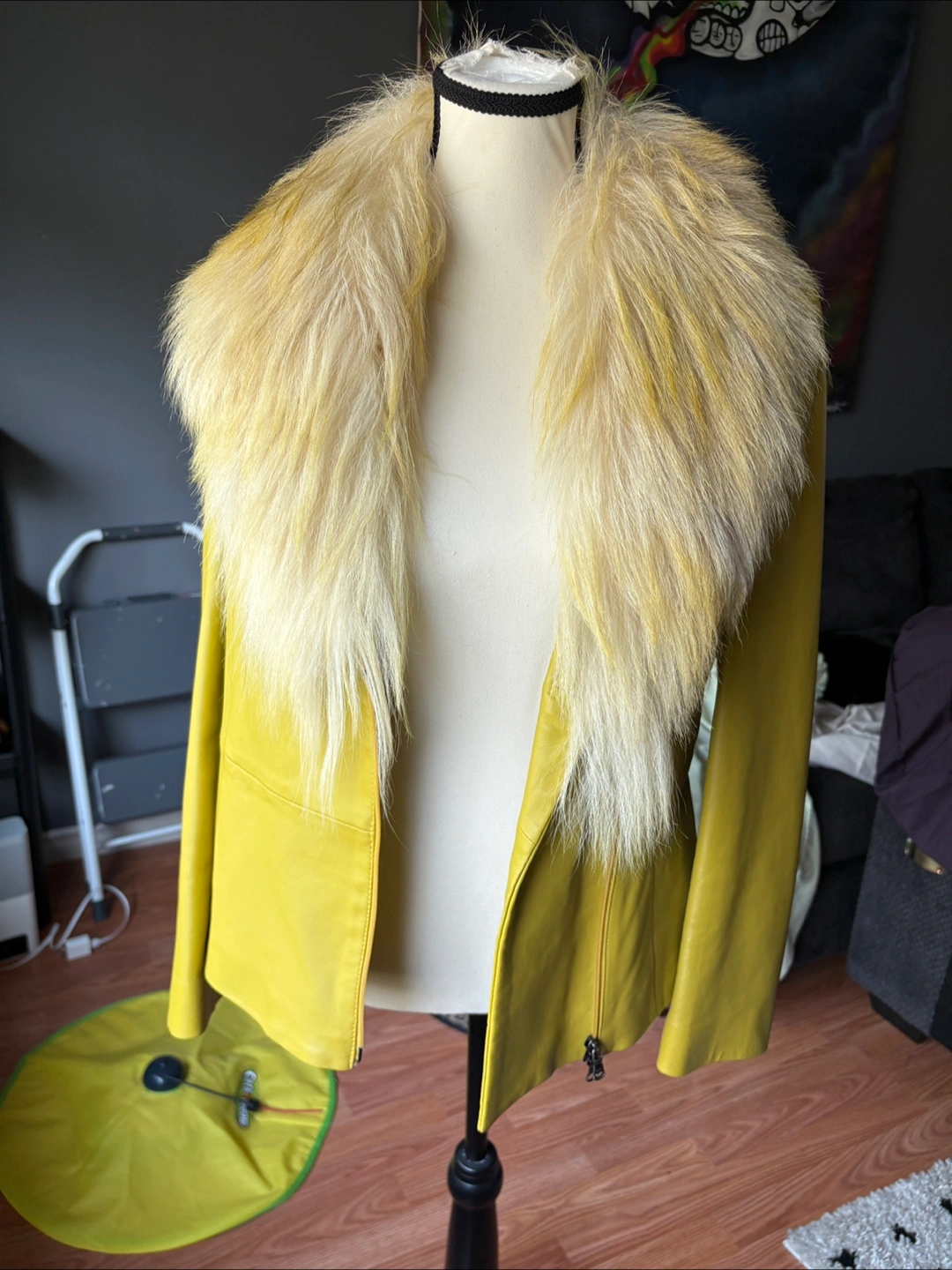 Real leather jacket. Features a large, fluffy fur collar. Zip front closure. Great for fall and winter. Size 42