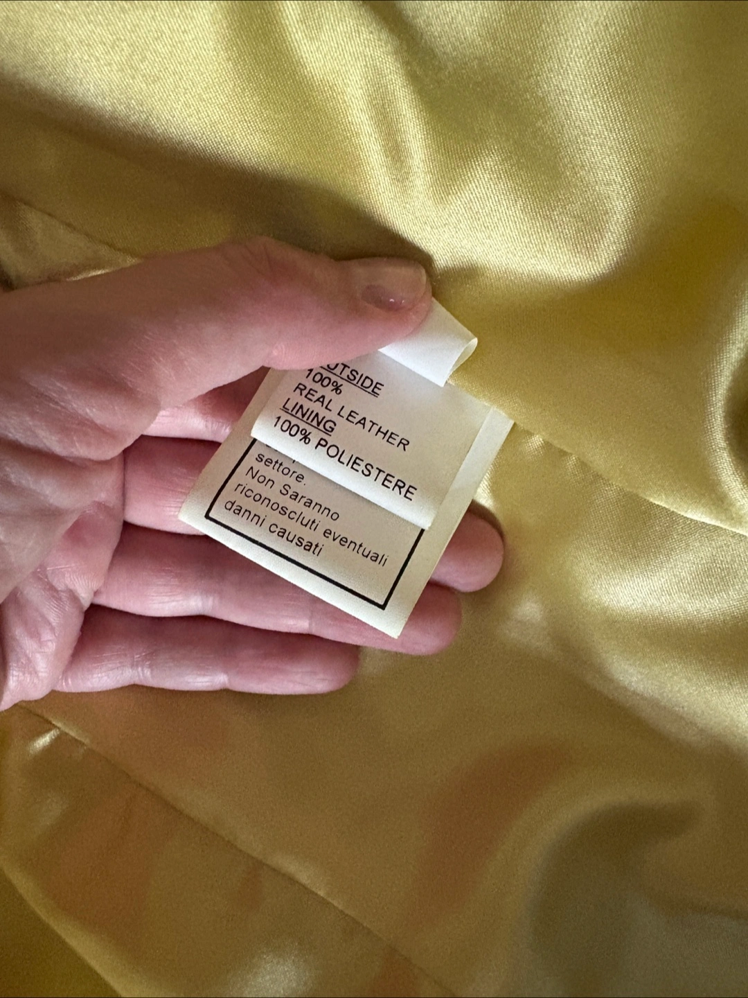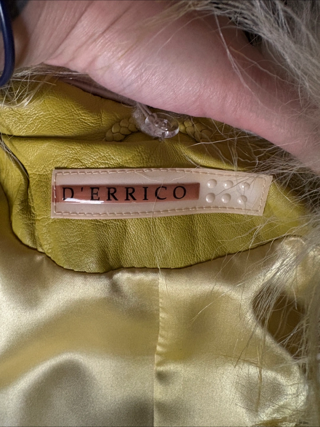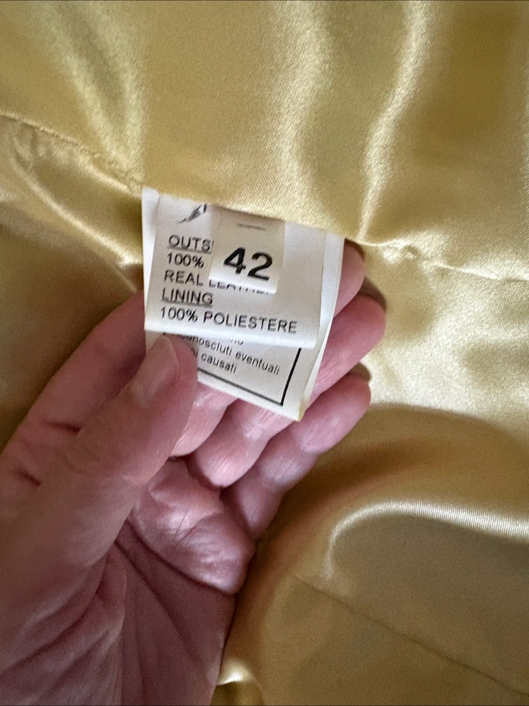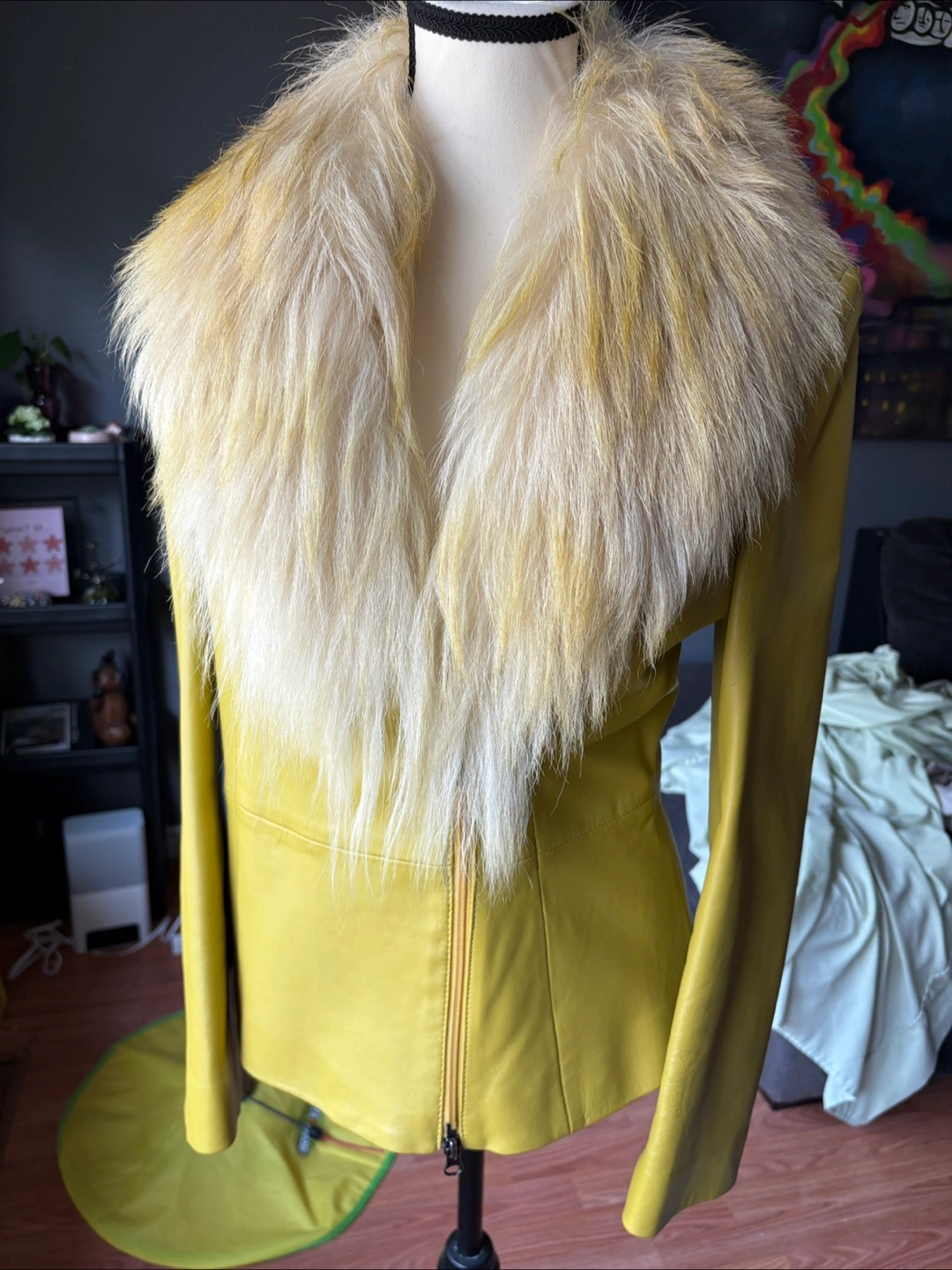 Real leather jacket. Features a large, fluffy fur collar. Zip front closure. Great for fall and winter. Size 42