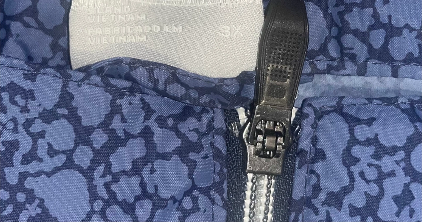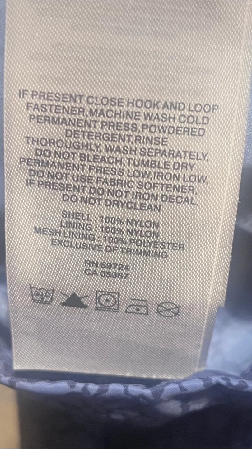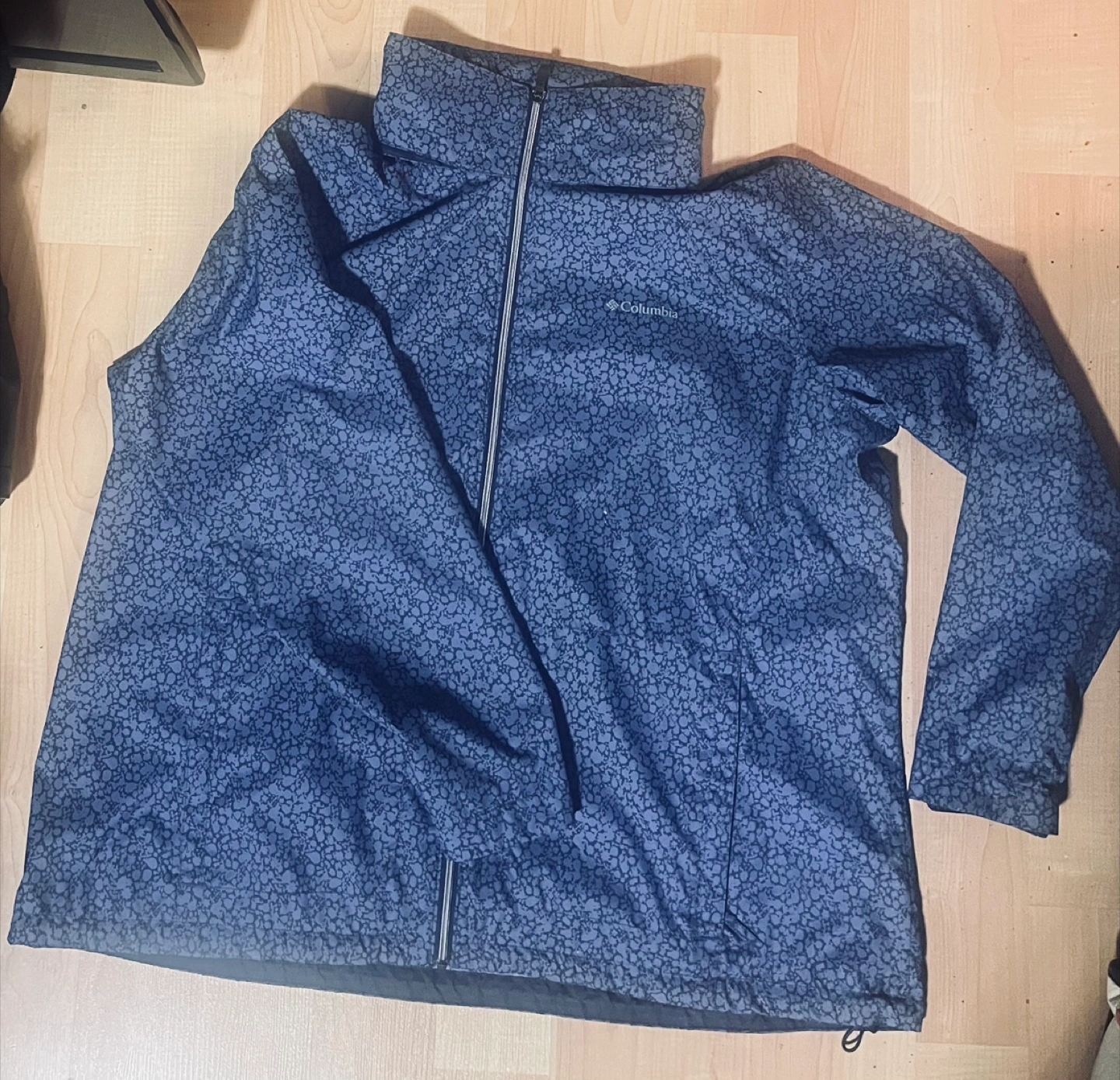 Women's Columbia packable jacket. Features a full zip closure and drawstring bottom. Blue with a dark print. 100% nylon shell and 100% polyester lining.