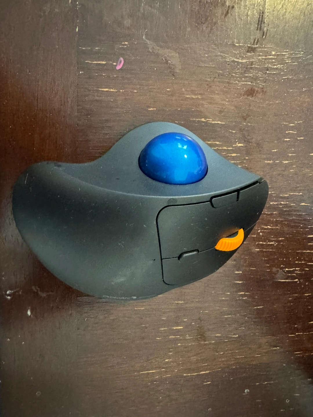 Ergonomic trackball mouse. Features a blue trackball and orange buttons. Used but in good condition.