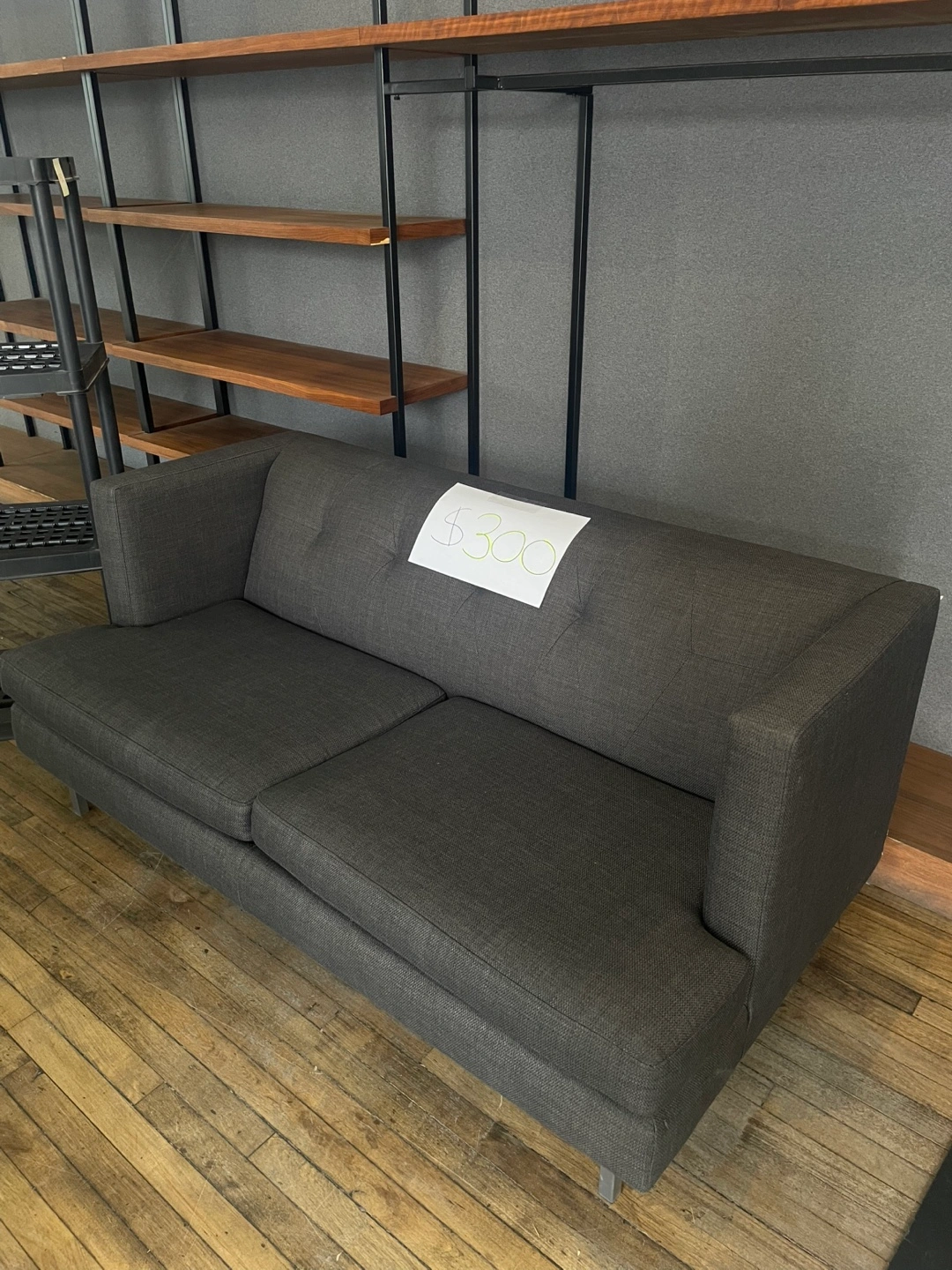 Modern two-seater sofa. Dark grey fabric upholstery. Simple design. Metal legs.