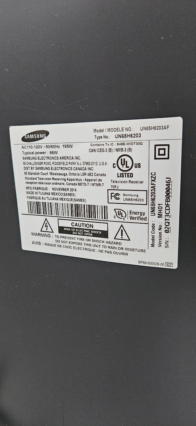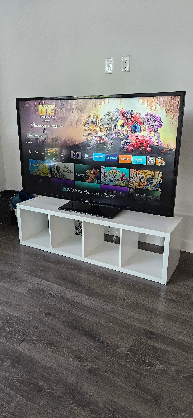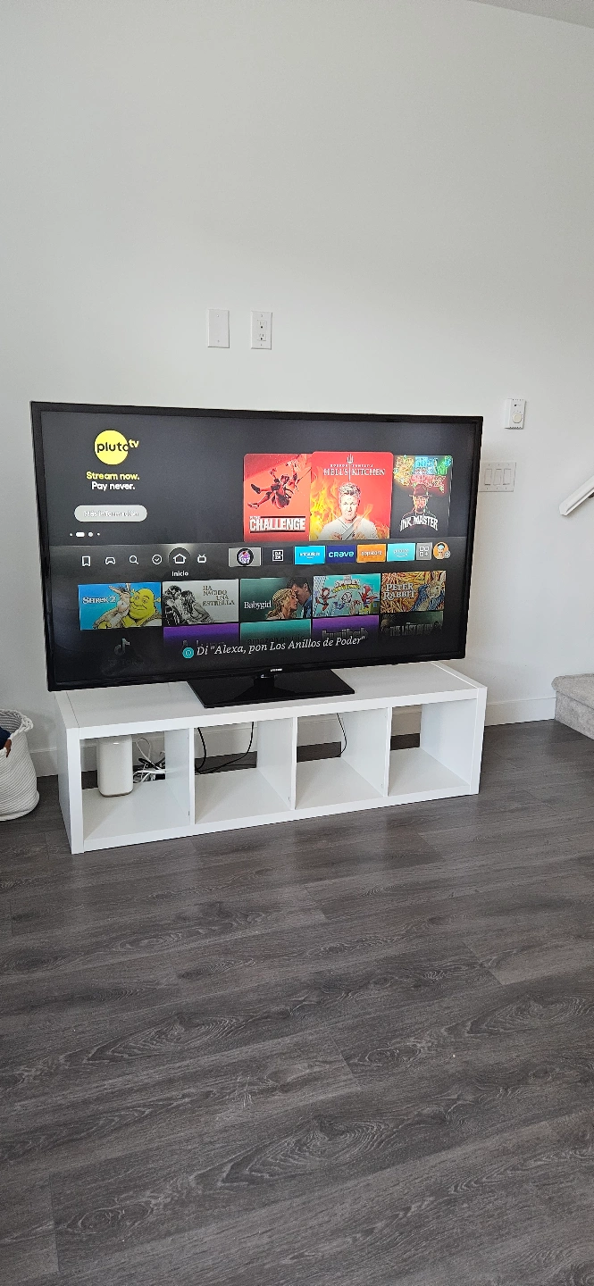 8365-inch Samsung Smart TV. Includes white TV stand. Great condition. Streaming apps available. Available on May 23rd