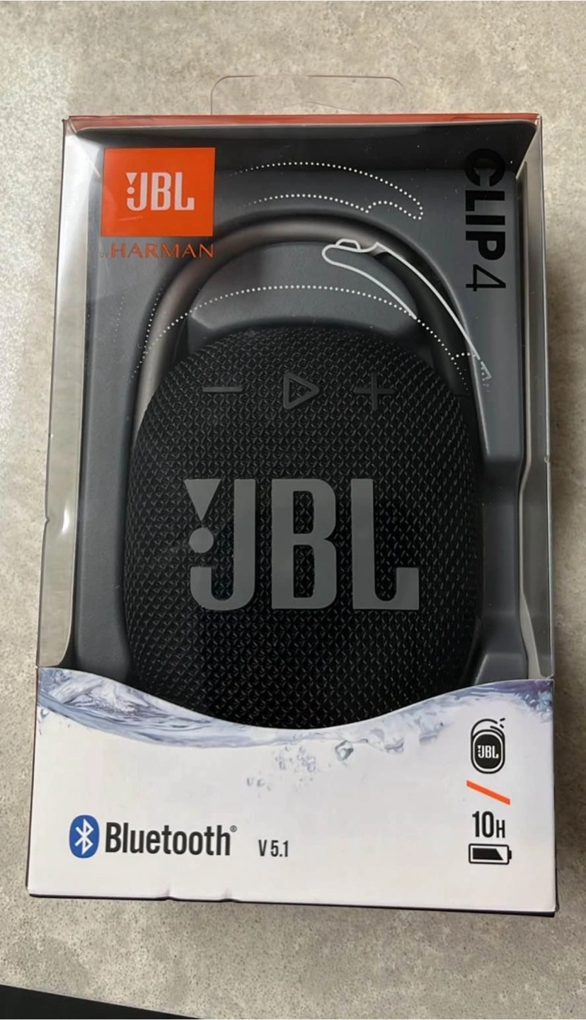 Portable Bluetooth speaker. Black. JBL Harman brand. Features a carabiner clip. Bluetooth 5.1. Up to 10 hours of playtime.