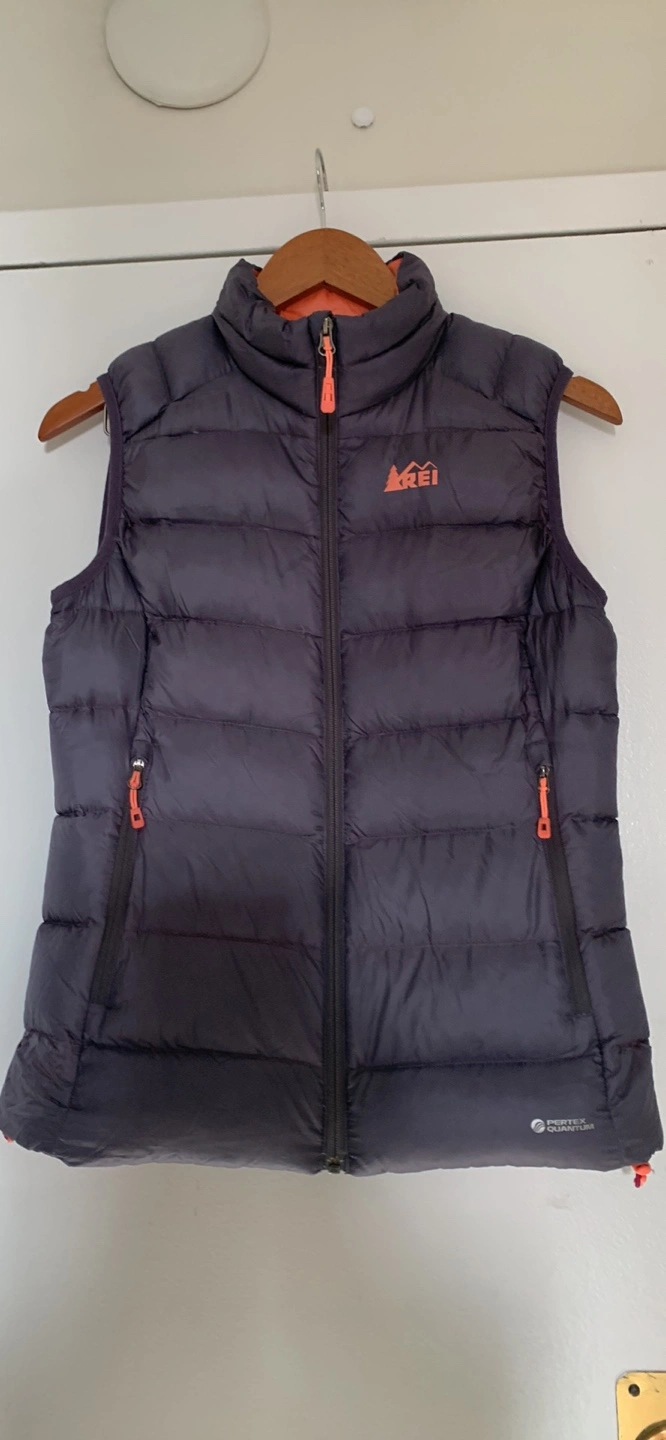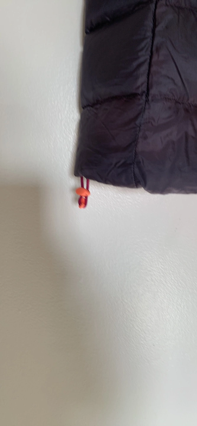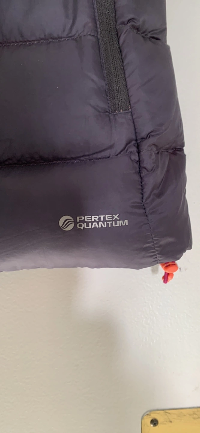 Women's down vest. Purple colour. Features Pertex Quantum fabric. Zipper closure. Side pockets. Drawcord hem.