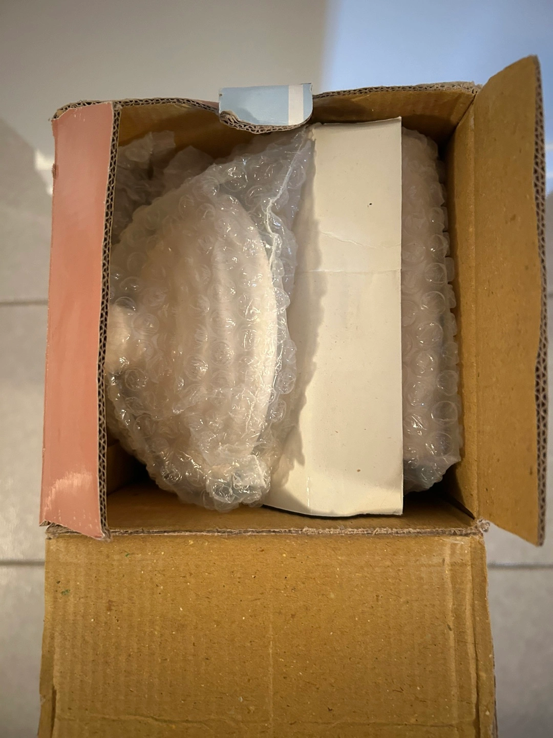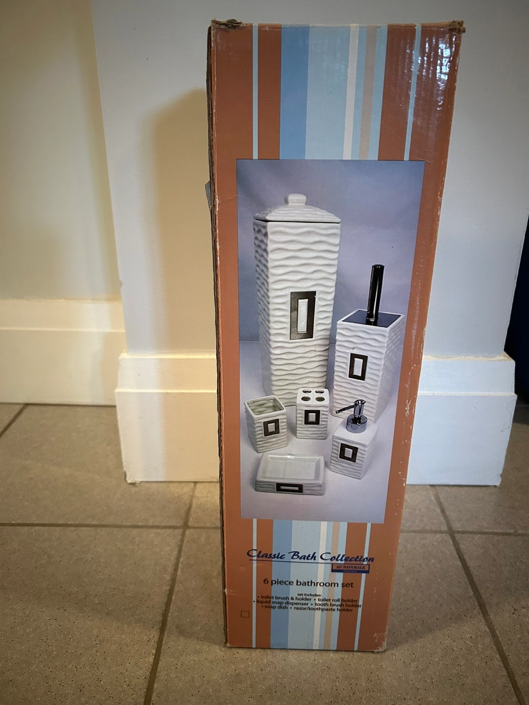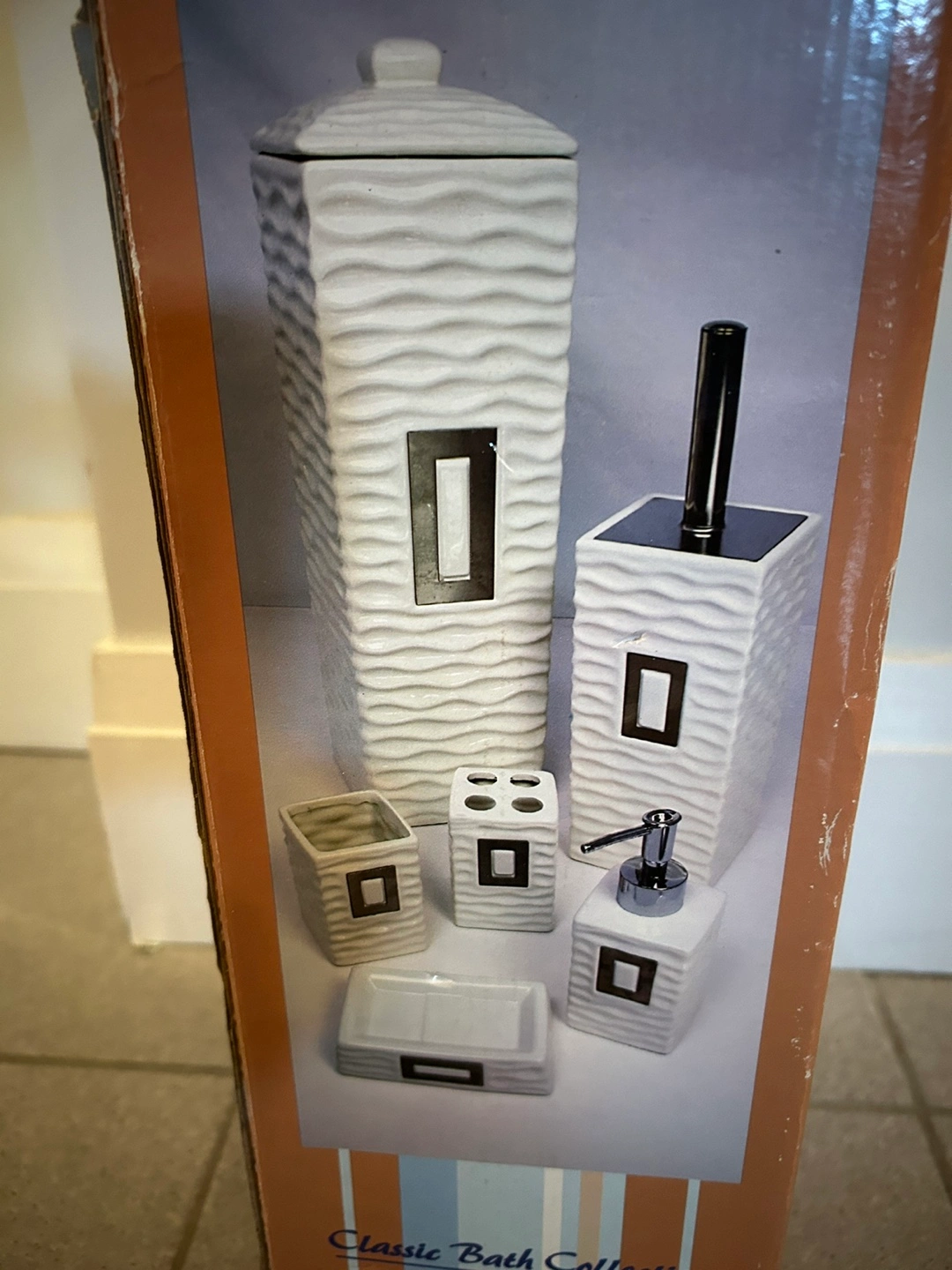 Brand new, still in box. Six-piece bathroom set. Includes toilet brush, tumbler, soap dispenser, toothbrush holder, and soap dish. Features a textured, wave-like design and metallic accents.