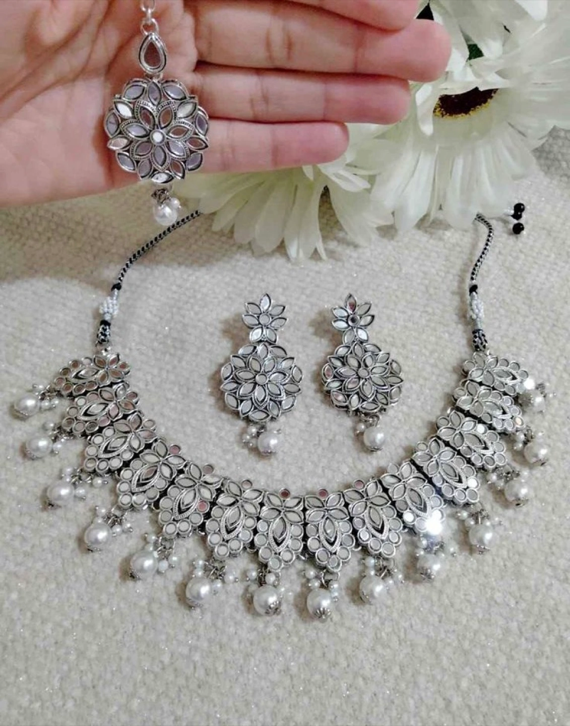 Stunning silver oxidized necklace set. Features intricate mirror work and pearl detailing. Includes matching earrings and maang tikka. Beautiful ethnic jewelry.