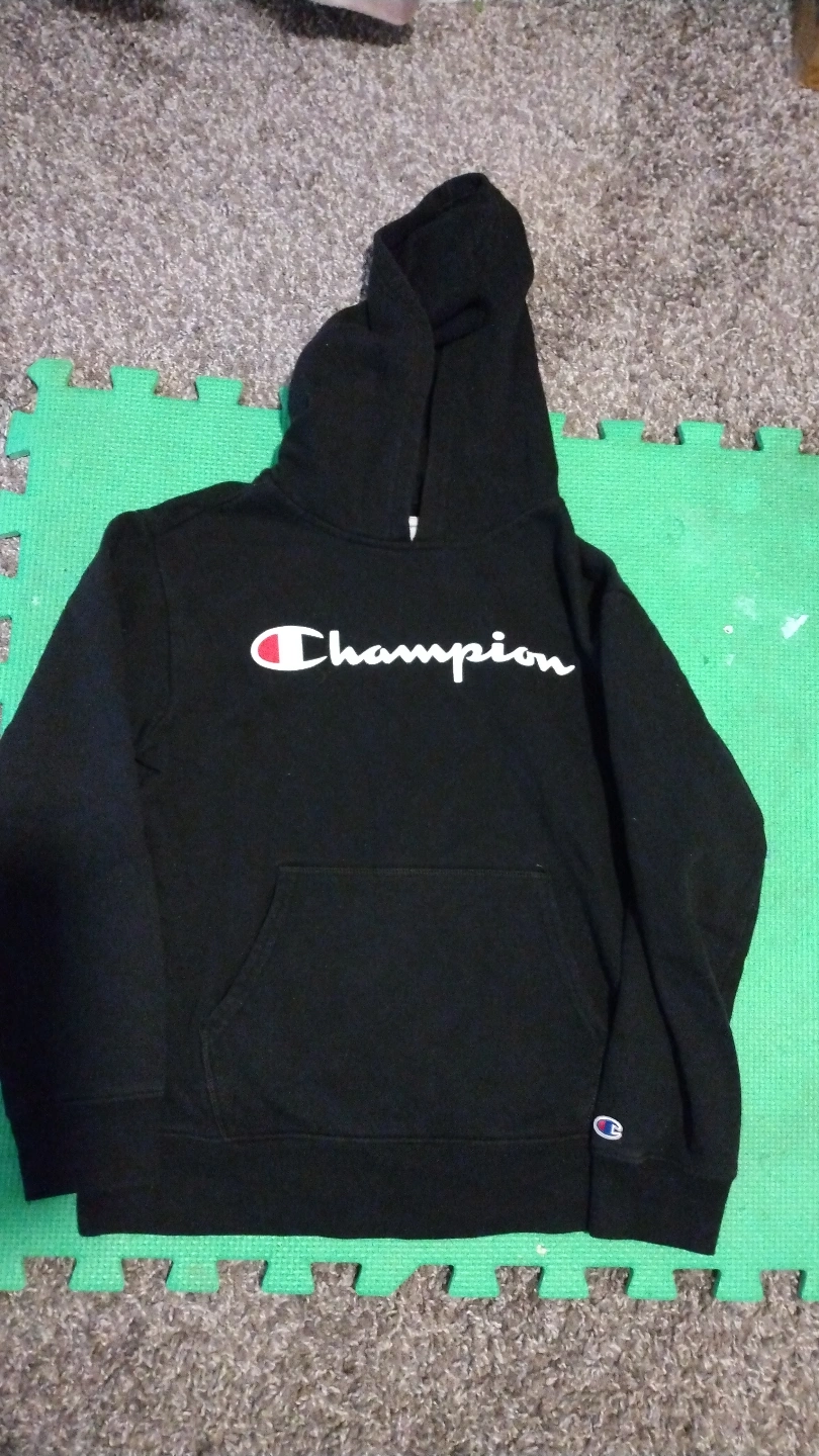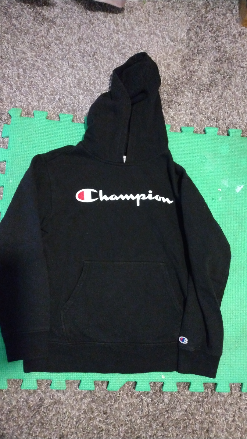 Black Champion hoodie. Features a large Champion logo on the chest. Has a hood and kangaroo pocket.
