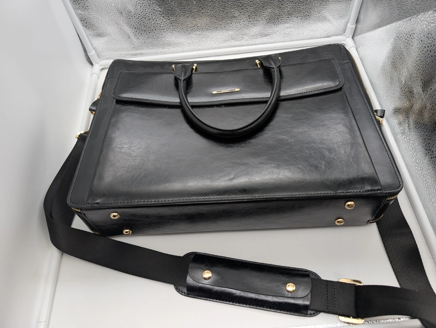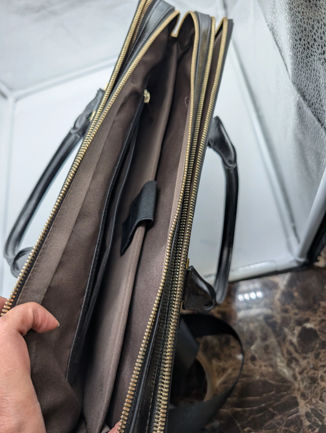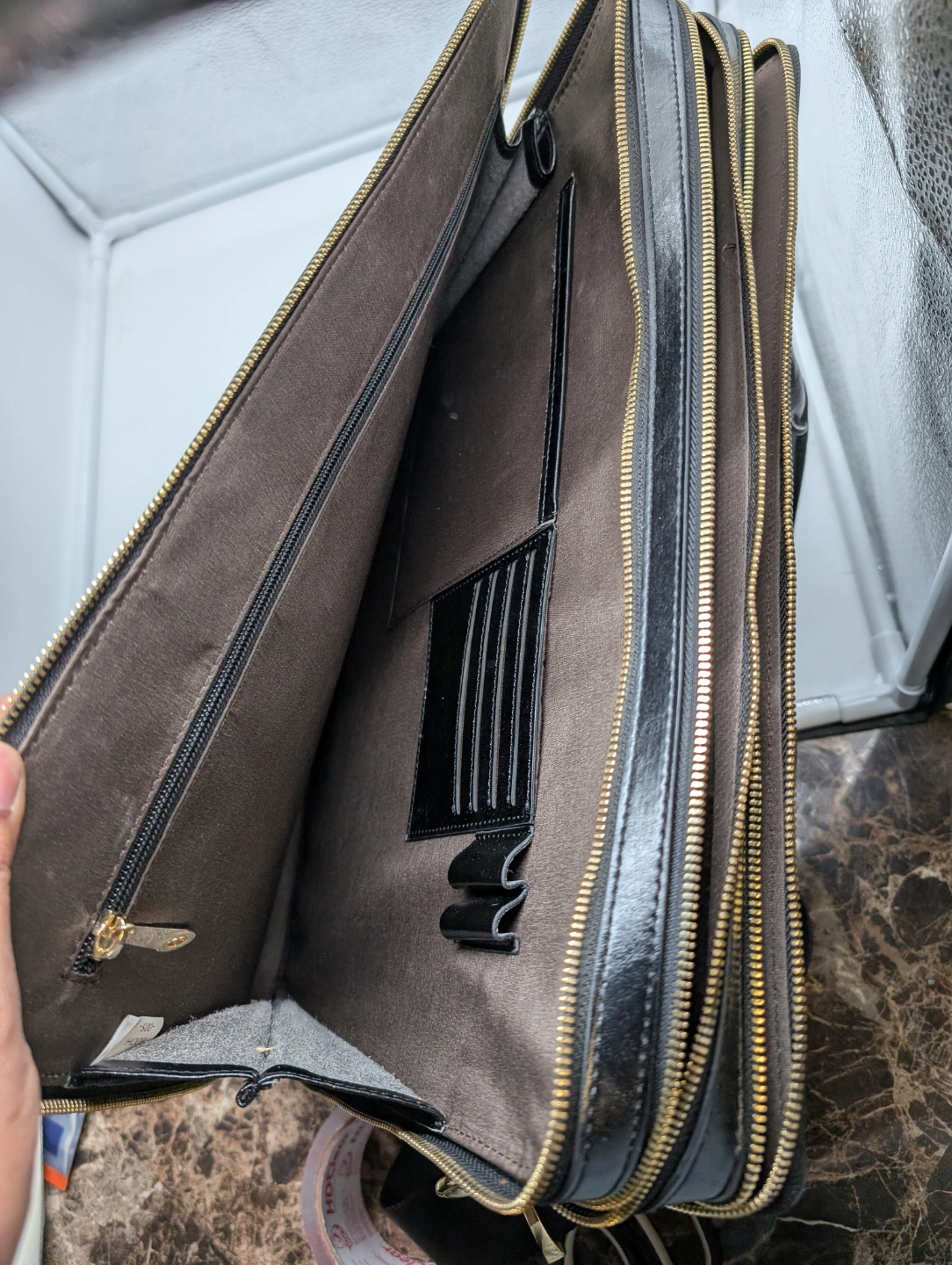 Large black briefcase. Features two main compartments, multiple interior pockets, and an adjustable shoulder strap. Gold-toned hardware. Zipper closures.