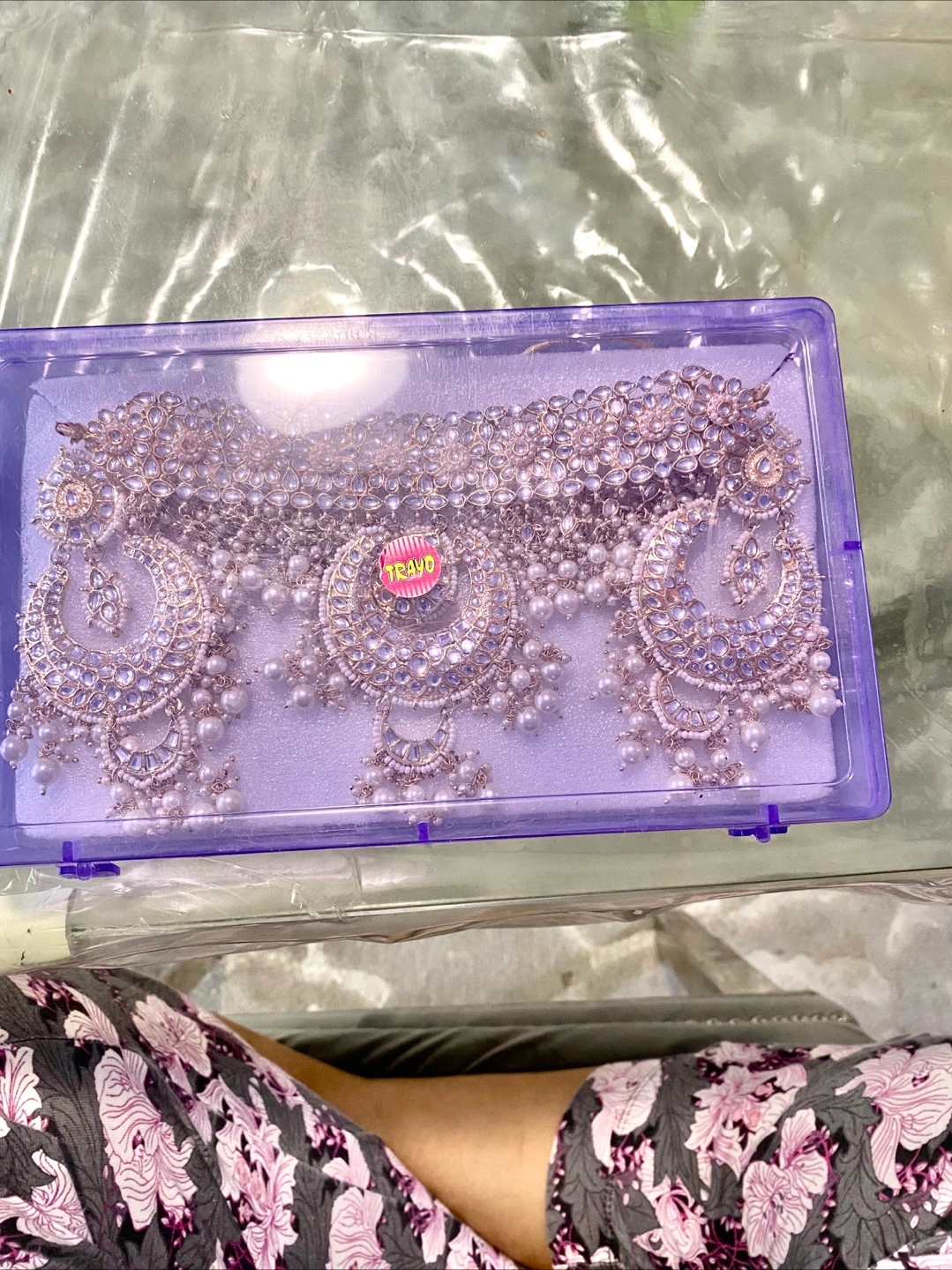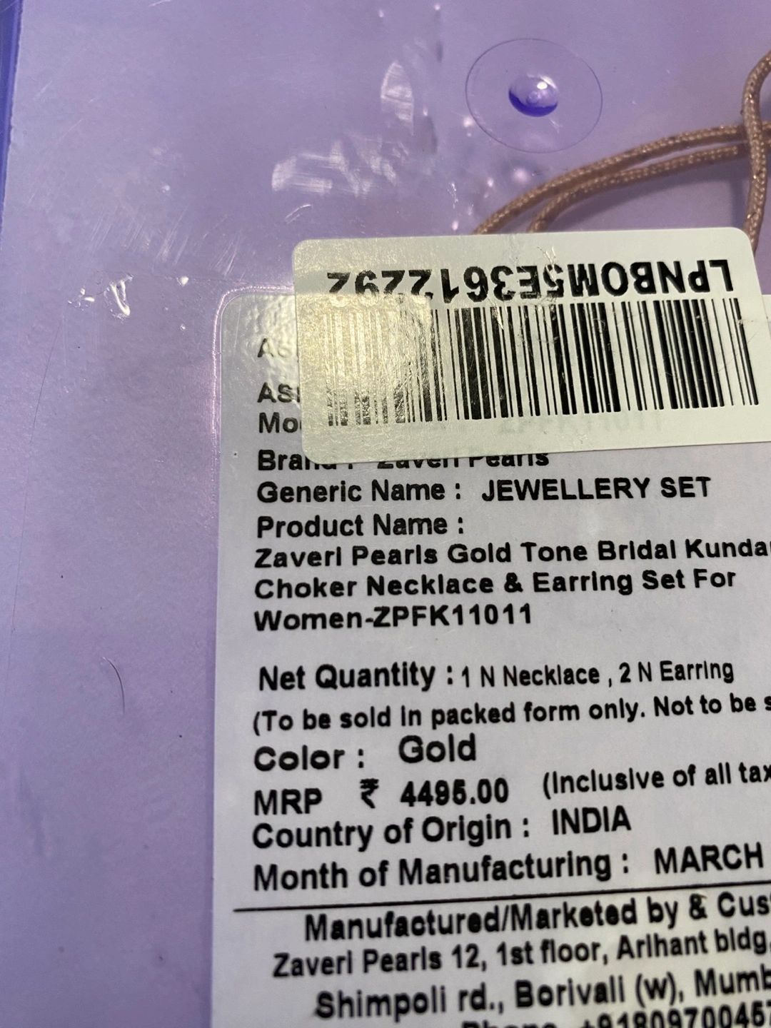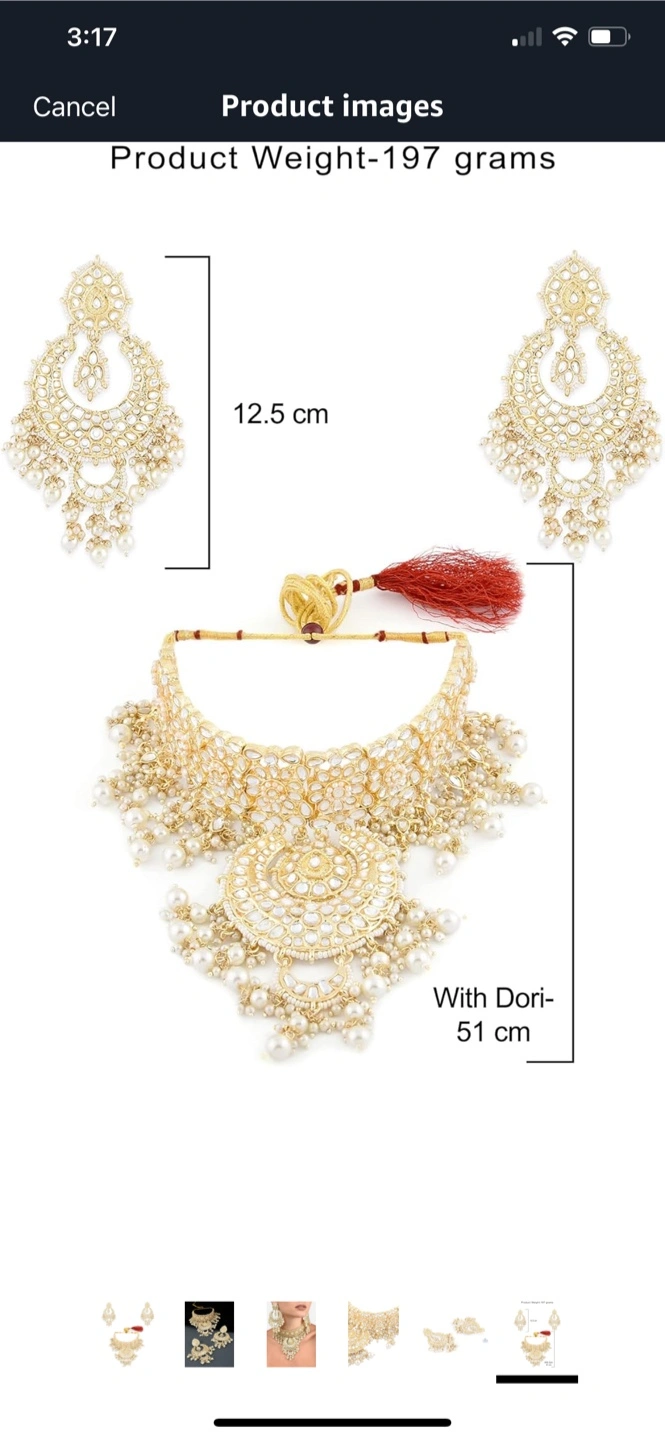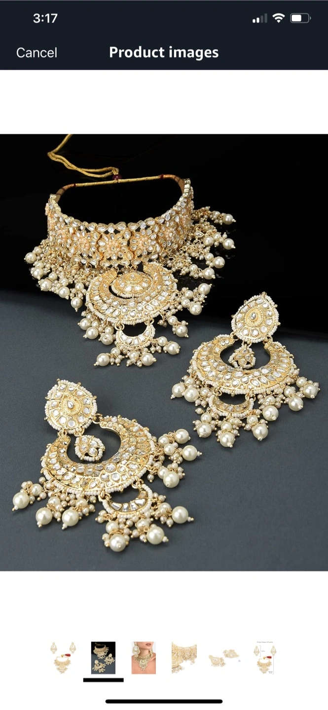 Beautiful bridal necklace set. Features gold-toned metal, kundan stones, and pearls. Includes a choker necklace and matching earrings. Intricate detailing. Perfect for special occasions.