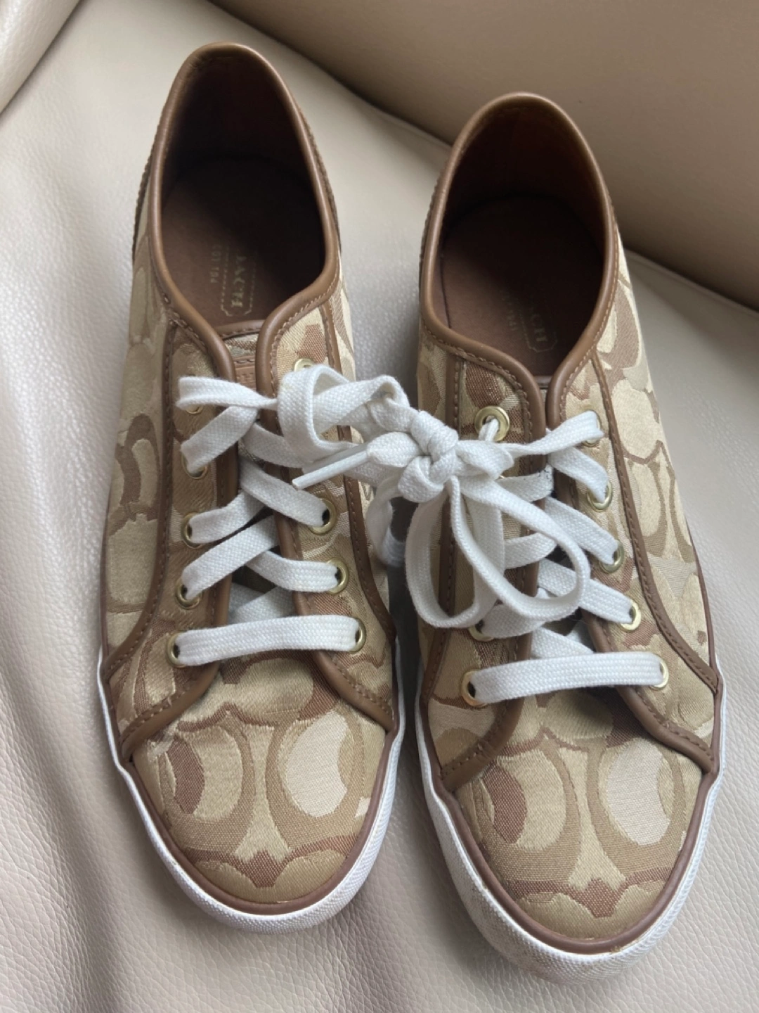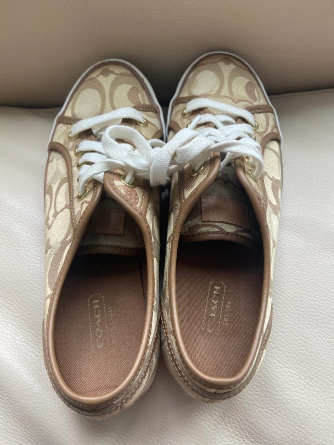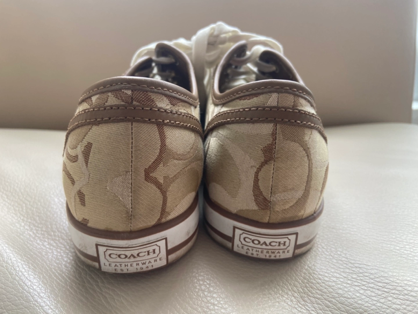 Women's low-top canvas sneakers. Beige and brown colour. Coach logo throughout. White laces.