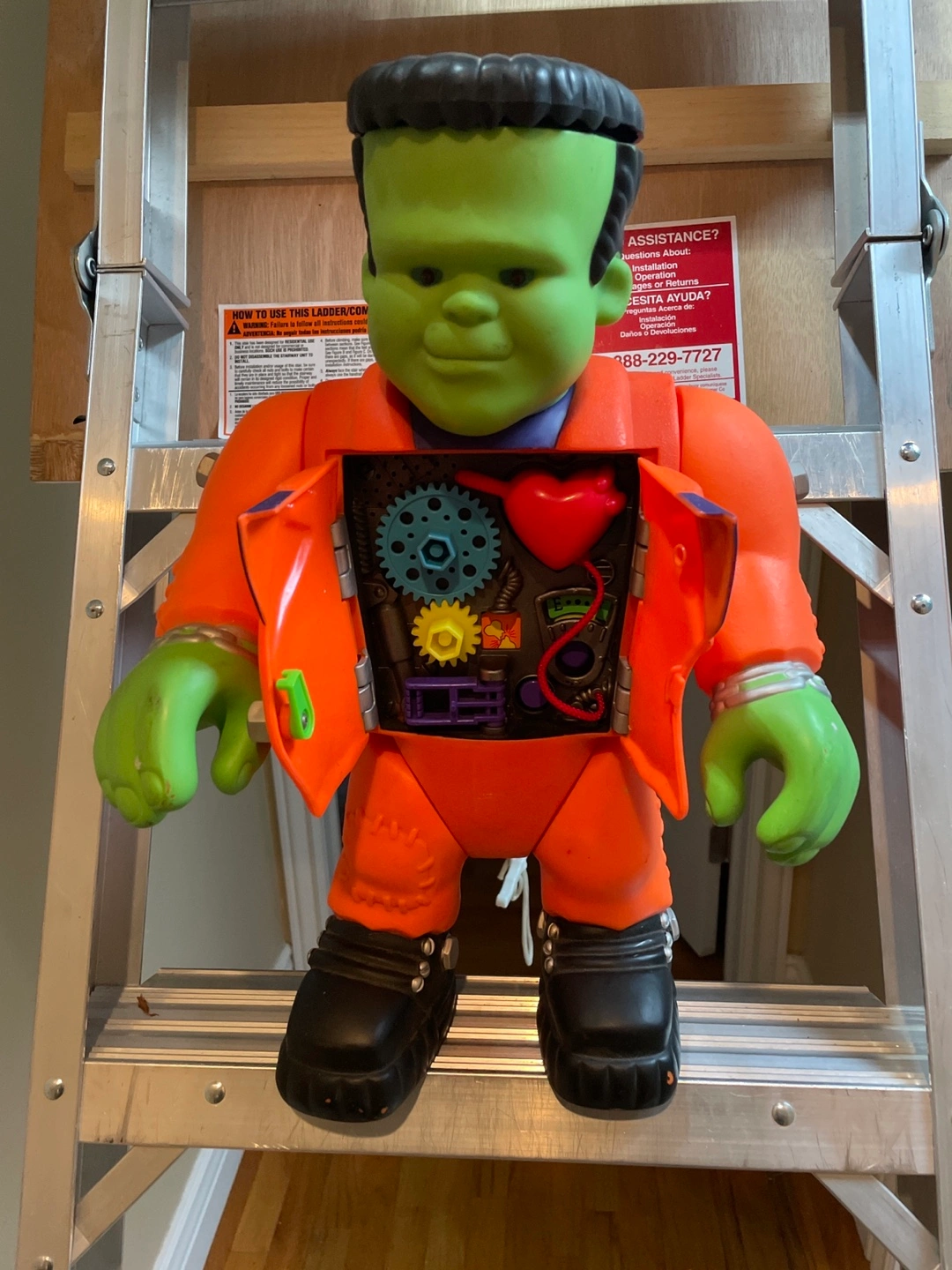 Unique collectible Frankenstein toy. Opens to reveal inner workings. Great Halloween decoration or addition to a vintage toy collection. Plastic construction. Shows some wear.