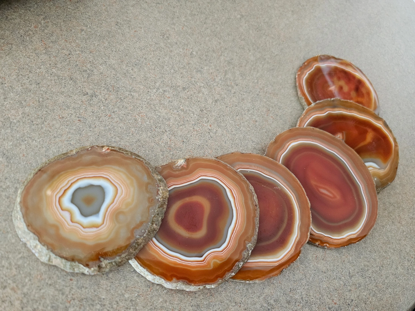 Set of 6 beautiful agate coasters. Natural stone, one of a kind, beautiful rings. Perfect for adding a touch of nature to your home decor. Coasters are cut consecutively therefore the size of each coaster varies.