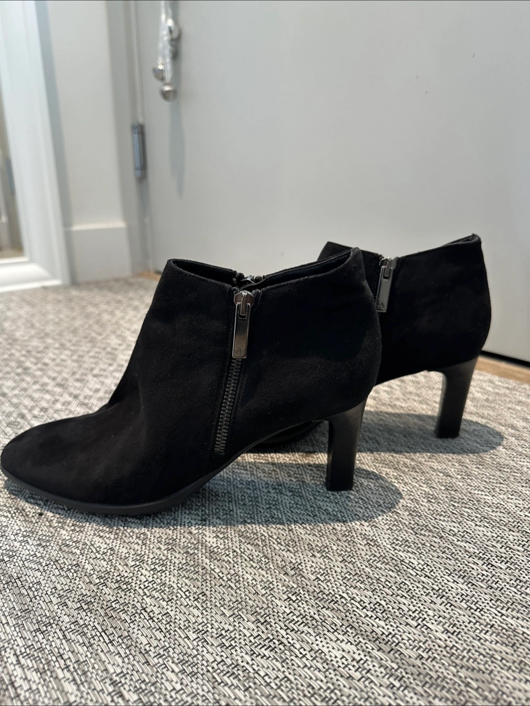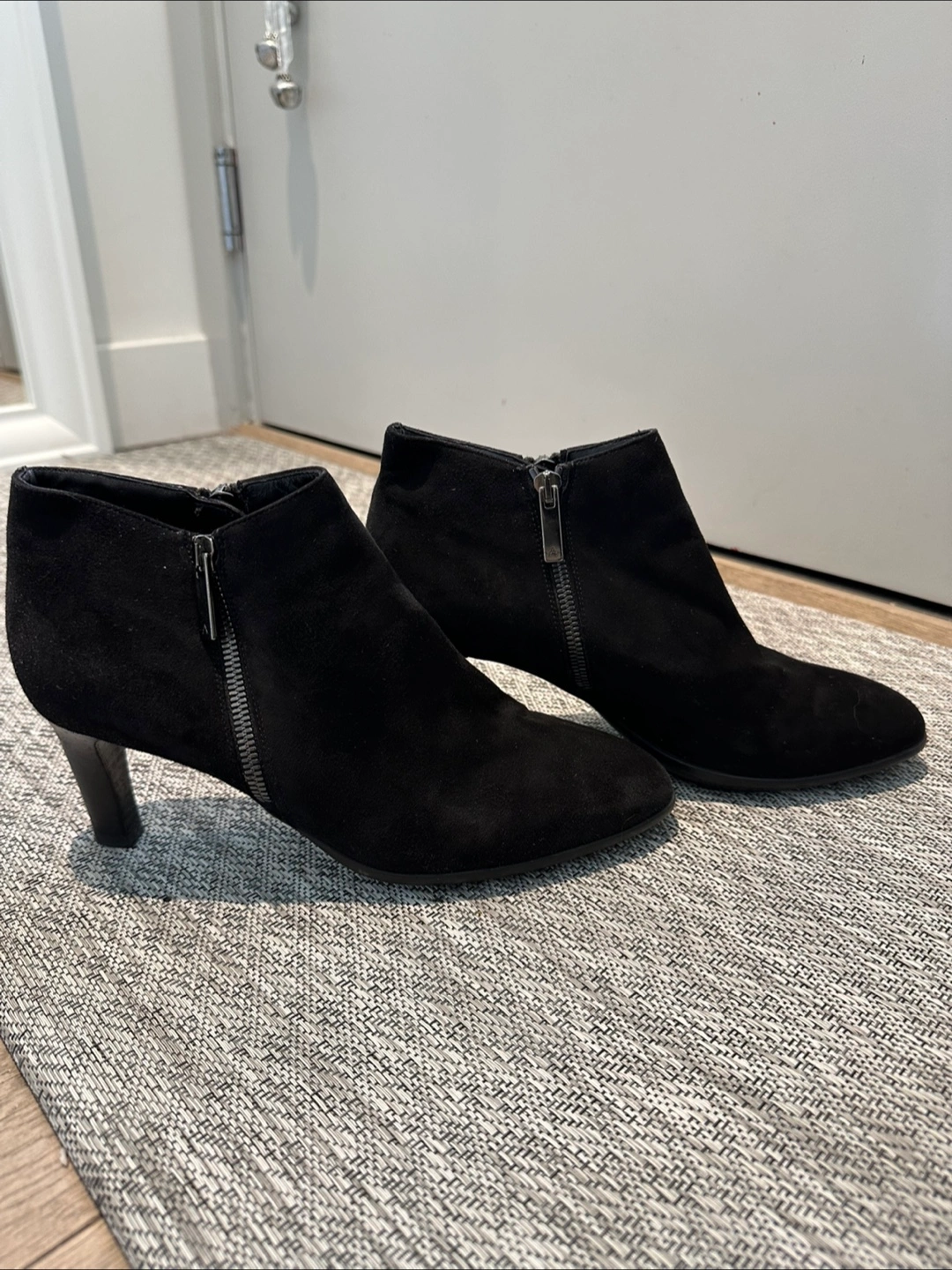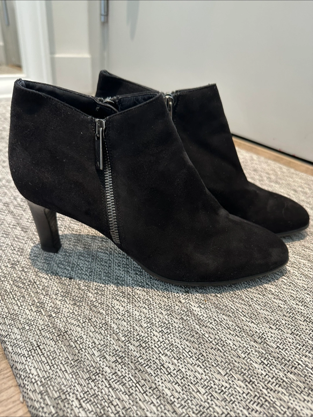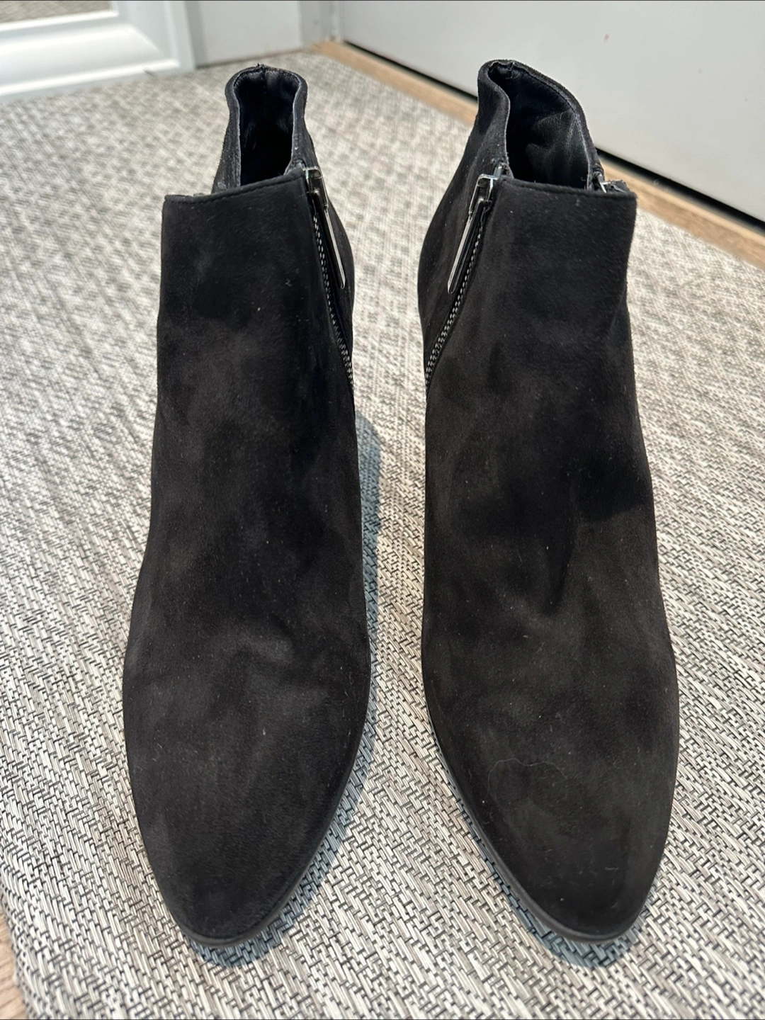 Aquatalia. Women's black suede like material ankle boots. Features a side zippers on both sides of boots and low heel. Pointed toe.