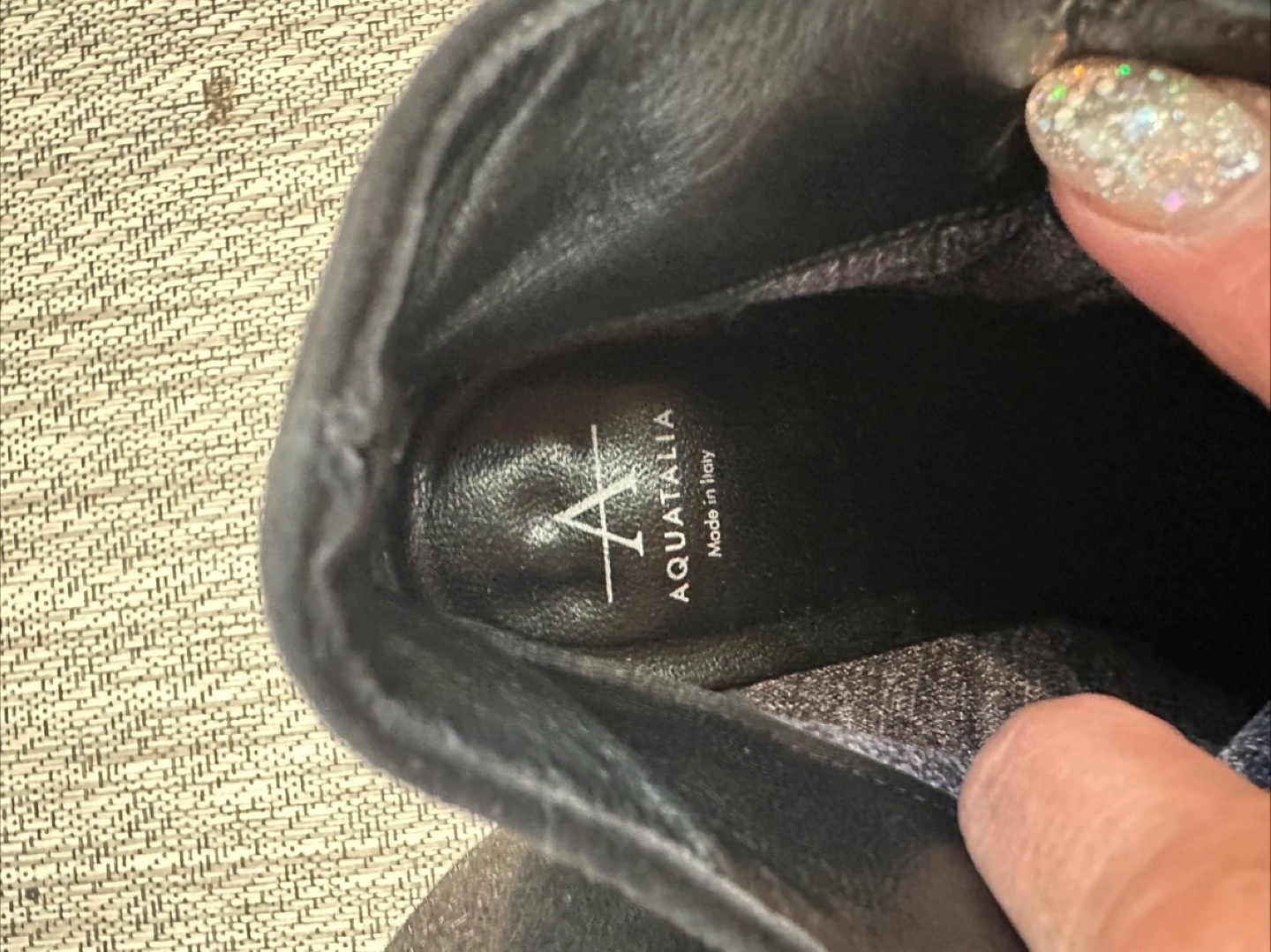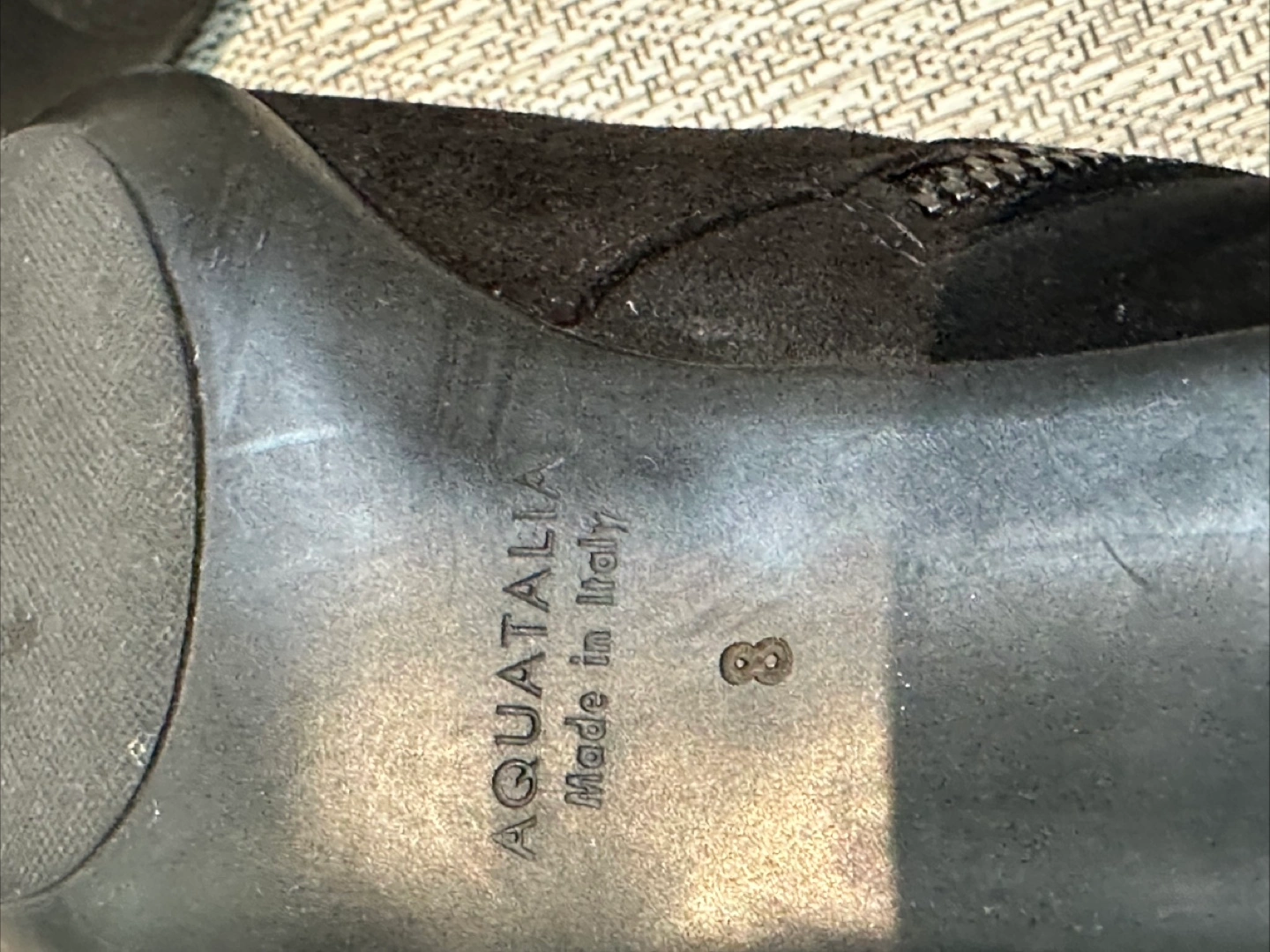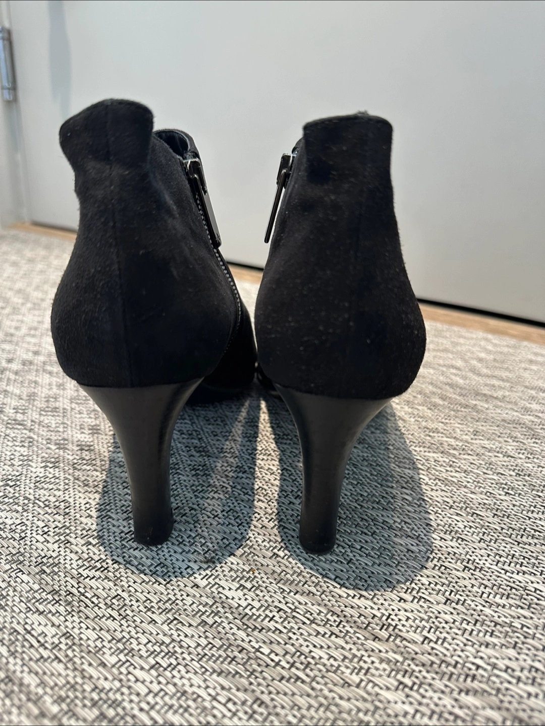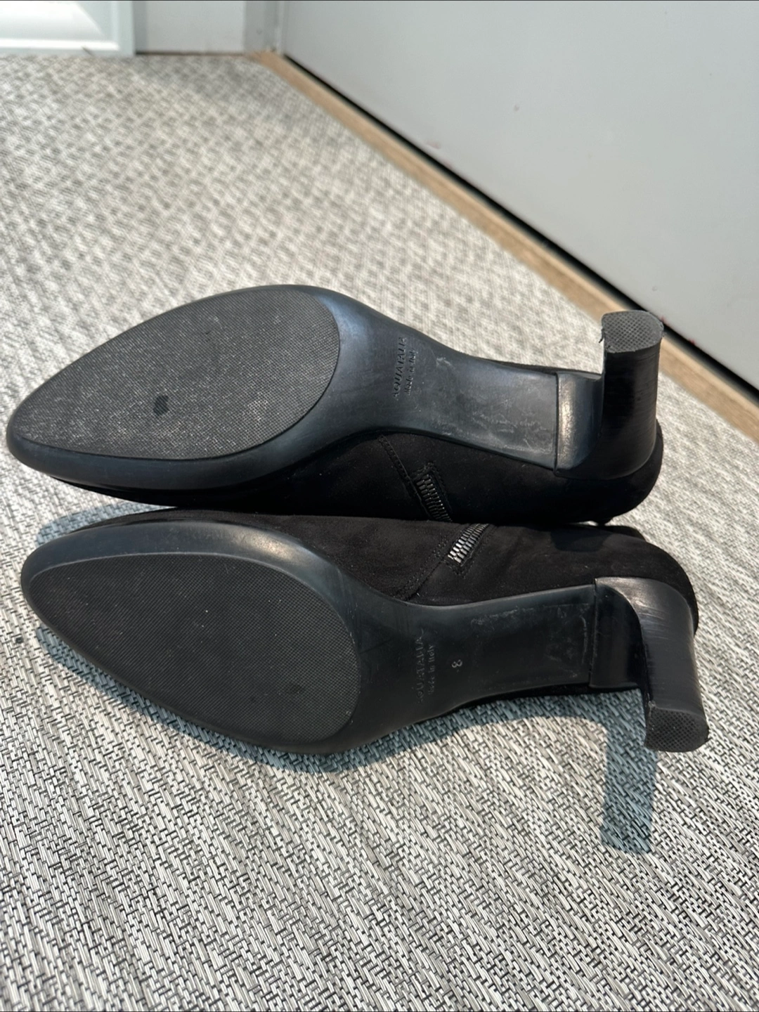Aquatalia. Women's black suede like material ankle boots. Features a side zippers on both sides of boots and low heel. Pointed toe.